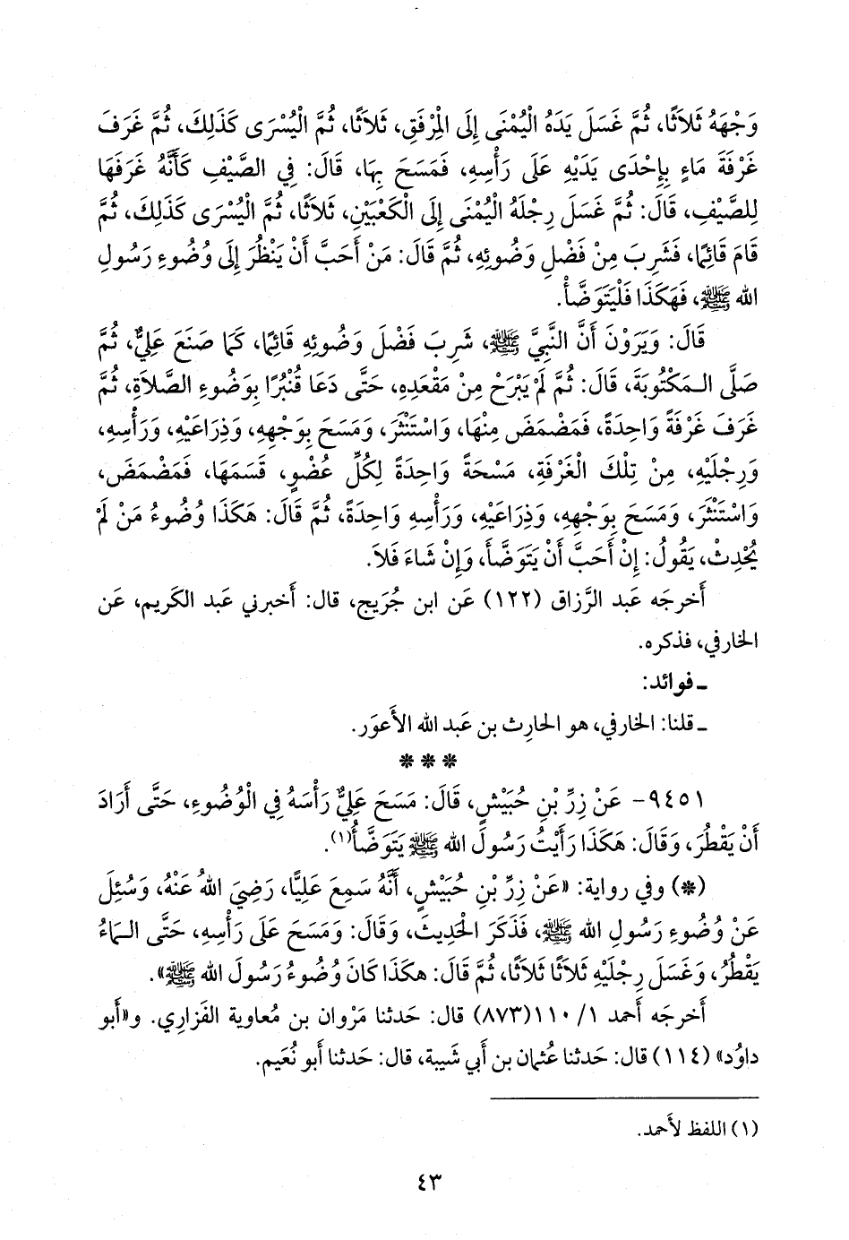 - وفي رواية: «عن زِرّ بن حُبَيش، أنه سمع عليا، رضي الله عنه، وسئل عن وضوء رسول الله صَلى الله عَليه وسَلم فذكر الحديث، وقال: ومسح على رأسه، حتى الماء يقطر، وغسل رجليه ثلاثا ثلاثا، ثم قال: هكذا كان وضوء رسول الله صَلى الله عَليه وسَلم».