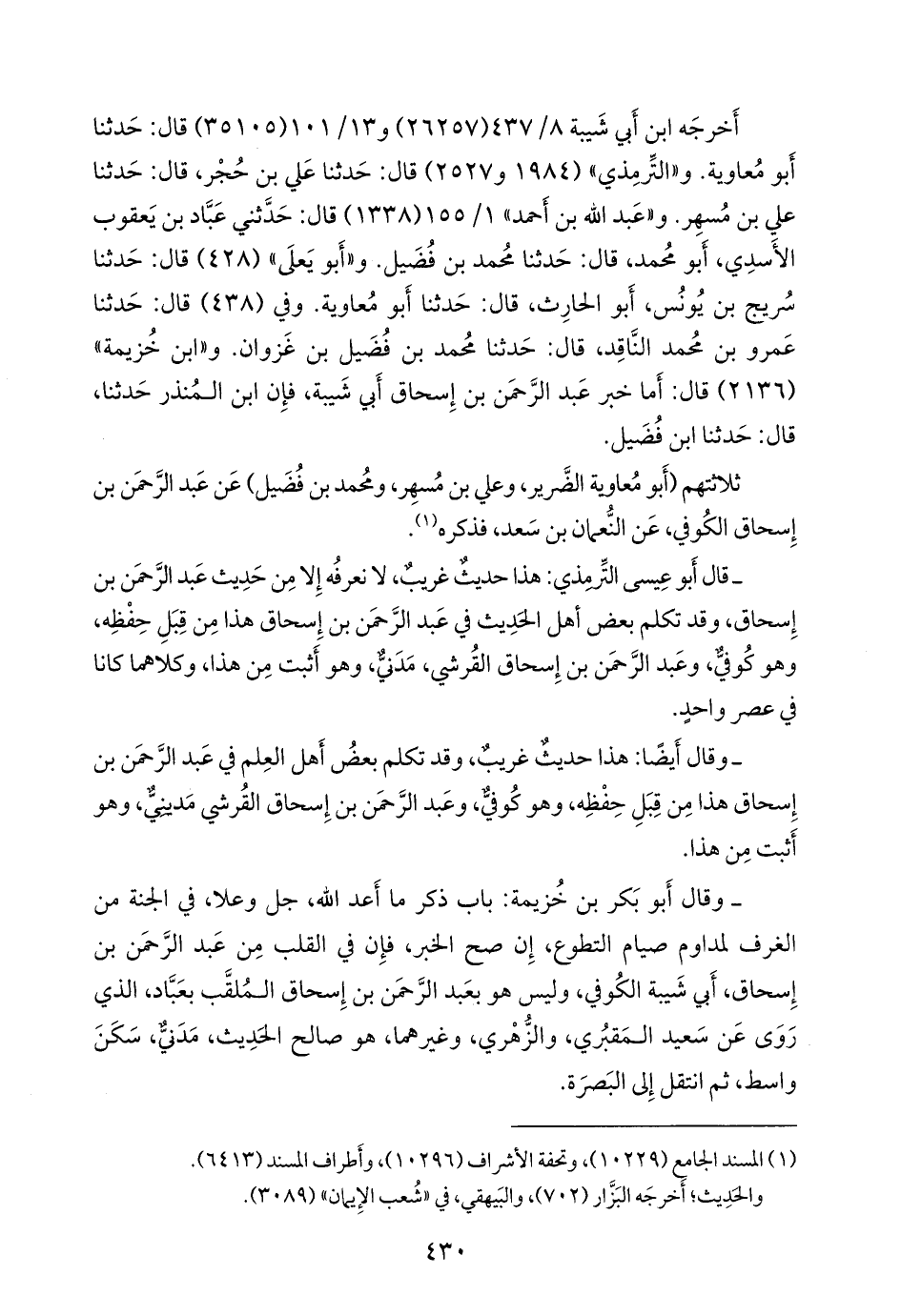 ثلاثتهم (أَبو معاوية الضرير، وعلي بن مُسهِر، ومحمد بن فضيل) عن عبد الرَّحمَن بن إسحاق الكوفي، عن النعمان بن سعد، فذكره (¬١).