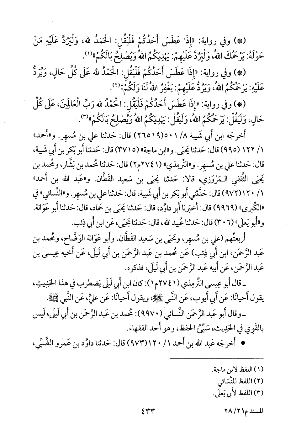 و «عبد الله بن أحمد» ١/ ١٢٠ (٩٧٢) قال: حدثني أَبو بكر بن أبي شيبة، قال: حدثنا علي بن مُسهِر. و «النَّسَائي» في «الكبرى» (٩٩٦٩) قال: أخبرنا أَبو داود، قال: حدثنا يحيى بن حماد، قال: حدثنا أَبو عَوانة. و «أَبو يَعلى» (٣٠٦) قال: حدثنا عُبيد الله، قال: حدثنا يحيى، عن ابن أبي ذِئب.