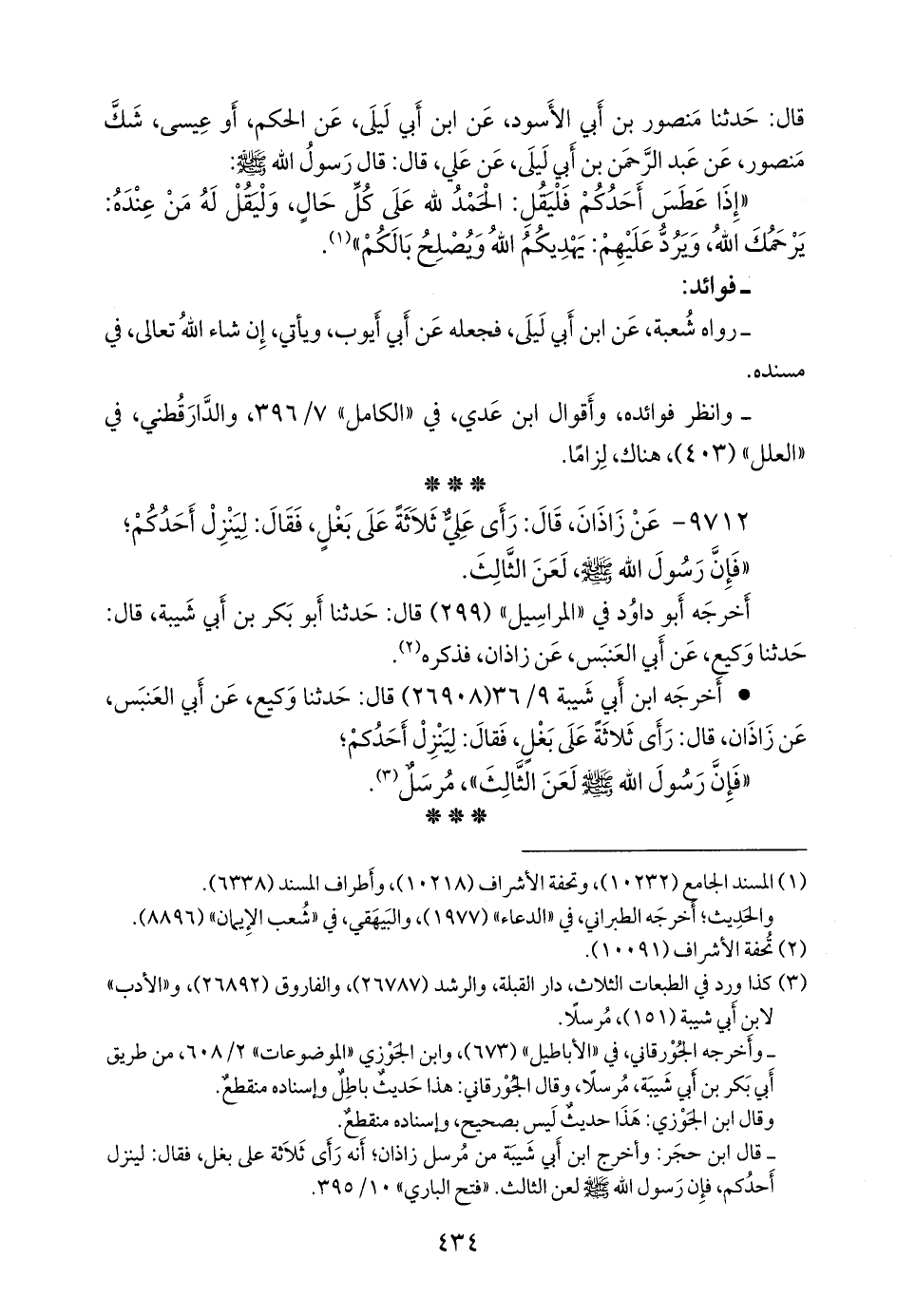 - قال ابن حجر: وأخرج ابن أبي شيبة من مرسل زاذان؛ أنه رأى ثلاثة على بغل، فقال: لينزل أحدكم، فإن رسول الله صَلى الله عَليه وسَلم لعن الثالث. «فتح الباري ٠/ ٣٩٥.