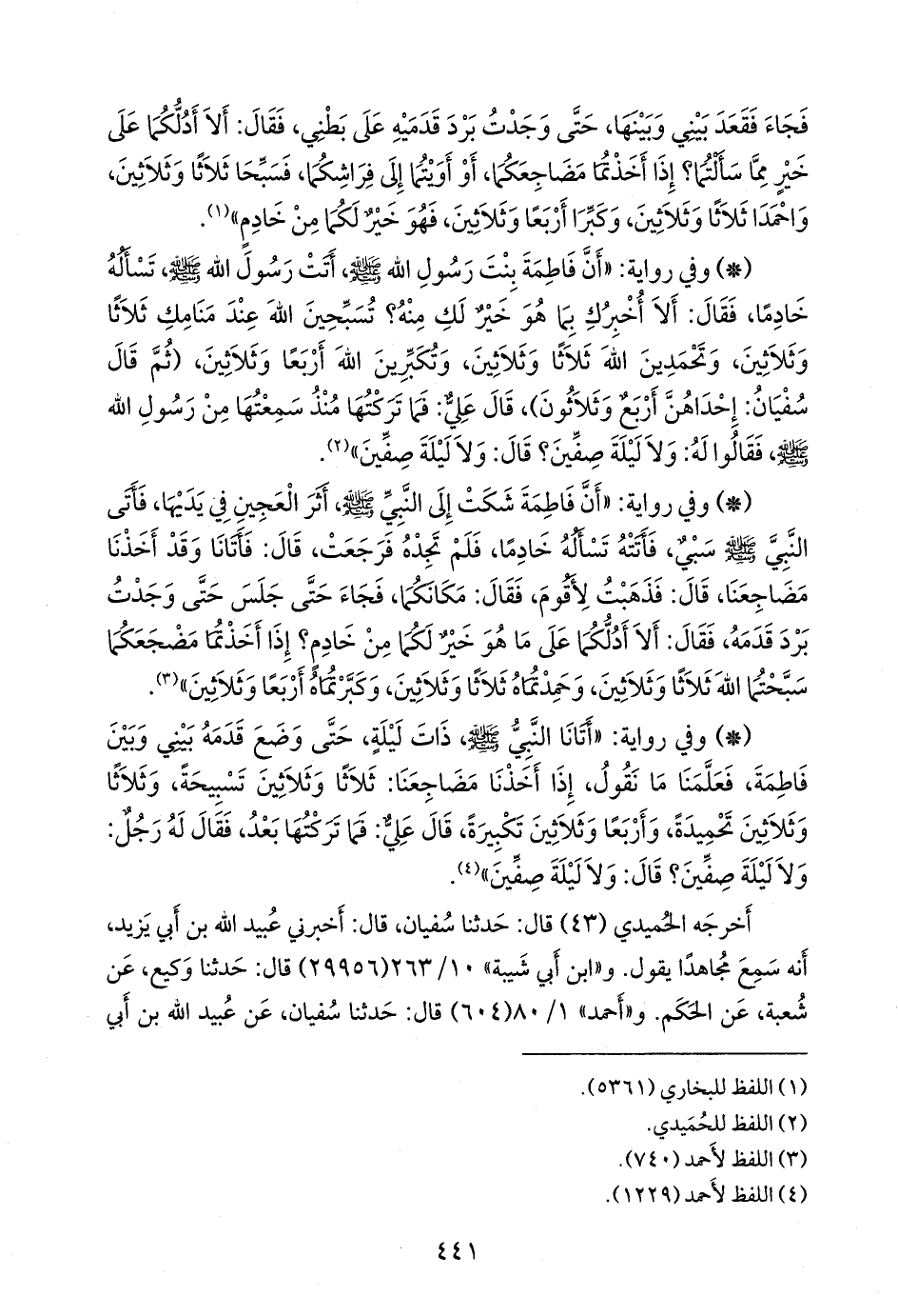 - وفي رواية: «أن فاطمة شكت إلى النبي صَلى الله عَليه وسَلم , أثر العجين في يديها، فأتى النبي صَلى الله عَليه وسَلم سبي، فأتته تسأله خادما، فلم تجده فرجعت، قال: فأتانا وقد أخذنا مضاجعنا، قال: فذهبت لأقوم، فقال: مكانكما، فجاء حتى جلس حتى وجدت برد قدمه، فقال: ألا أدلكما على ما هو خير لكما من خادم؟ إذا أخذتما مضجعكما سبحتما الله ثلاثا وثلاثين، وحمدتماه ثلاثا وثلاثين، وكبرتماه أربعا وثلاثين» (¬١).