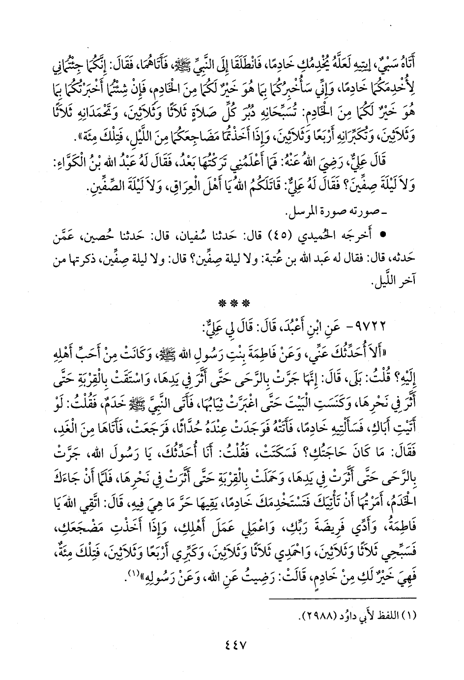 «ألا أحدثك عني، وعن فاطمة بنت رسول الله صَلى الله عَليه وسَلم وكانت من أحب أهله إليه؟ قلت: بلى، قال: إنها جرت بالرحى حتى أثر في يدها، واستقت بالقربة حتى أثر في نحرها، وكنست البيت حتى اغبرت ثيابها، فأتى النبي صَلى الله عَليه وسَلم خدم، فقلت: لو أتيت أباك، فسألتيه خادما، فأتته فوجدت عنده حداثا، فرجعت، فأتاها من الغد، فقال: ما كان حاجتك؟ فسكتت، فقلت: أنا أحدثك، يا رسول الله، جرت بالرحى حتى أثرت في يدها، وحملت بالقربة حتى أثرت في نحرها، فلما أن جاءك الخدم، أمرتها أن تأتيك فتستخدمك خادما، يقيها حر ما هي فيه، قال: اتقي الله يا فاطمة، وأدي فريضة ربك، واعملي عمل أهلك، وإذا أخذت مضجعك، فسبحي ثلاثا وثلاثين، واحمدي ثلاثا وثلاثين، وكبري أربعا وثلاثين، فتلك مئة، فهي خير لك من خادم، قالت: رضيت عن الله، وعن رسوله» (¬١).