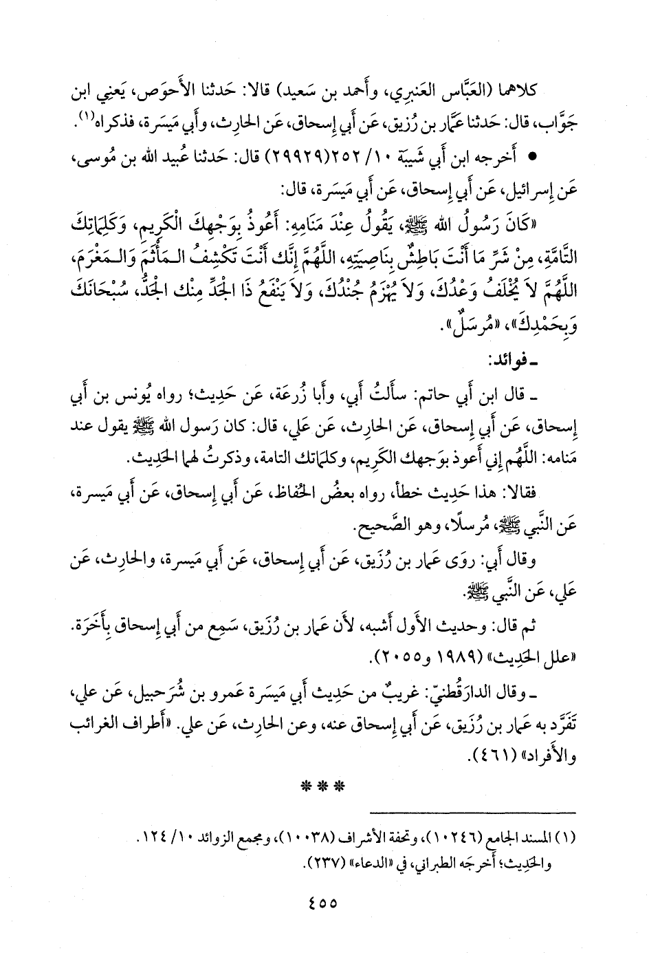 - قال عبد الرَّحمَن بن أبي حاتم الرازي: سألت أبي، وأَبا زُرعَة، عن حديث؛ رواه يونس بن أبي إسحاق، عن أبي إسحاق، عن الحارث، عن علي، قال: كان رسول الله صَلى الله عَليه وسَلم يقول عند منامه: اللهم إني أعوذ بوجهك الكريم، وكلماتك التامة، وذكرت لهما الحديث.
