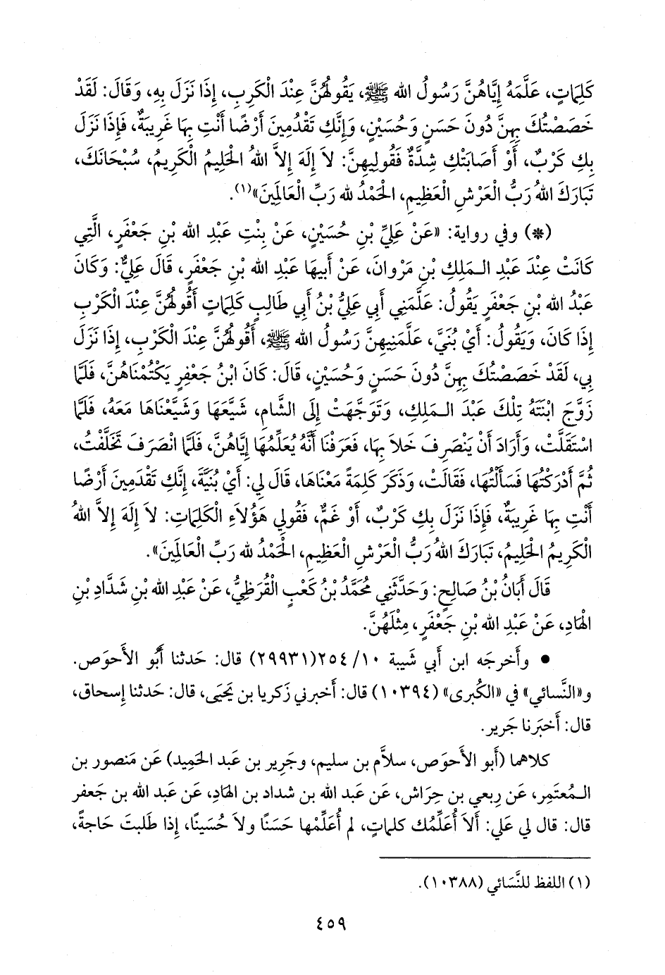 كلاهما (أَبو الأحوص سَلَّام بن سليم، وجرير بن عبد الحميد) عن منصور بن المُعتَمِر, عن رِبعي بن حِراش, عن عبد الله بن شداد بن الهاد, عن عبد الله بن جعفر قال: قال لي علي: ألا أعلمك كلمات، لم أعلمها حسنا ولا حسينا، إذا طلبت حاجة،