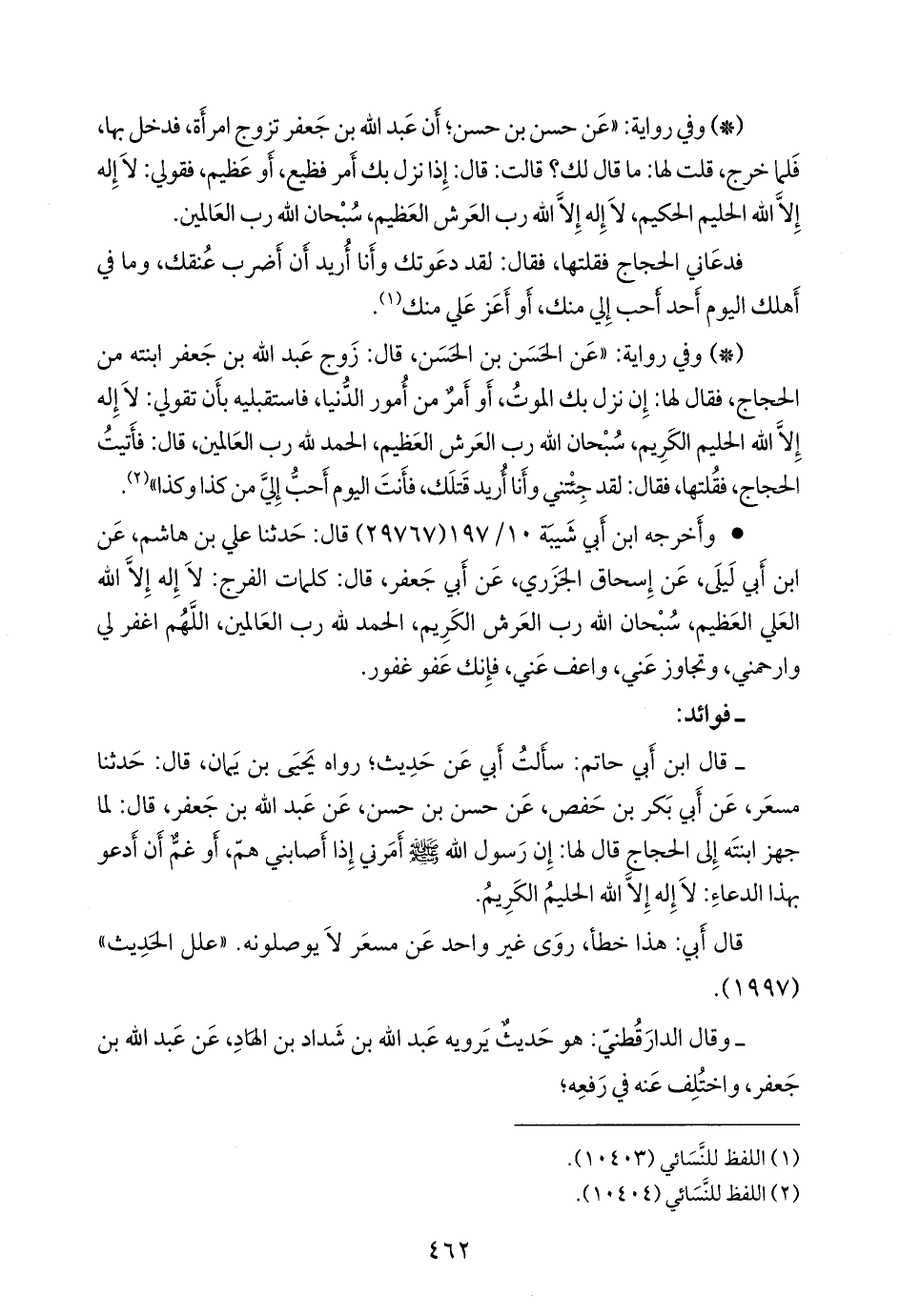 - قال عبد الرَّحمَن بن أبي حاتم الرازي: سألتُ أبي عن حديثٍ؛ رواه يحيى بن يمان، قال: حدثنا مسعر، عن أَبي بكر بن حفص، عن حسن بن حسن، عن عبد الله بن جعفر، قال: لما جهز ابنته إلى الحجاج قال لها: إن رسول الله صَلى الله عَليه وسَلم أمرني إذا أصابني هم، أو غم أن أدعو بهذا الدعاء: لا إله إلا الله الحليم الكريم.
