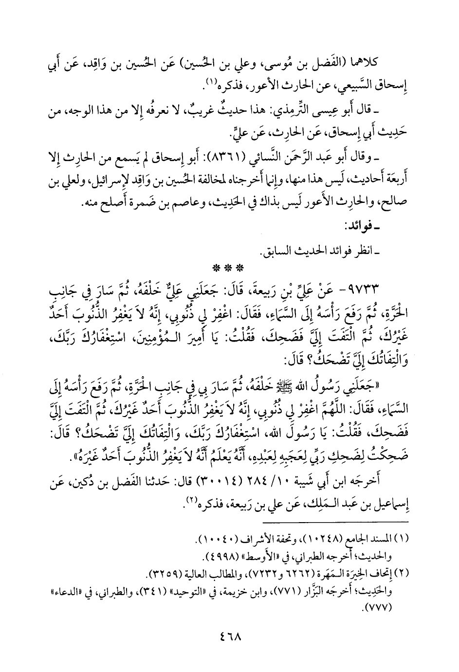 ٩٧٣٣ - عن علي بن ربيعة، قال: جعلني علي خلفه، ثم سار في جانب الحرة، ثم رفع رأسه إلى السماء، فقال: اغفر لي ذنوبي، إنه لا يغفر الذنوب أحد غيرك، ثم التفت إلي فضحك, فقلت: يا أمير المؤمنين, استغفارك ربك, والتفاتك إلي تضحك؟ قال: