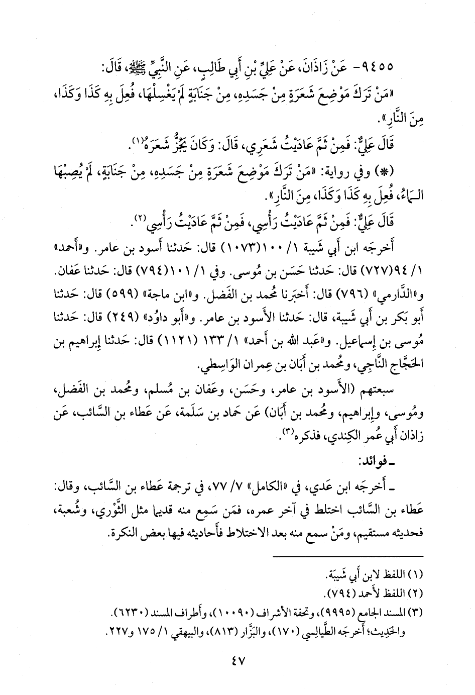 سبعتهم (الأسود بن عامر، وحسن، وعفان بن مسلم، ومحمد بن الفضل، وموسى، وإبراهيم، ومحمد بن أبان) عن حماد بن سلمة، عن عطاء بن السائب، عن زاذان أبي عمر الكندي، فذكره (¬٣).