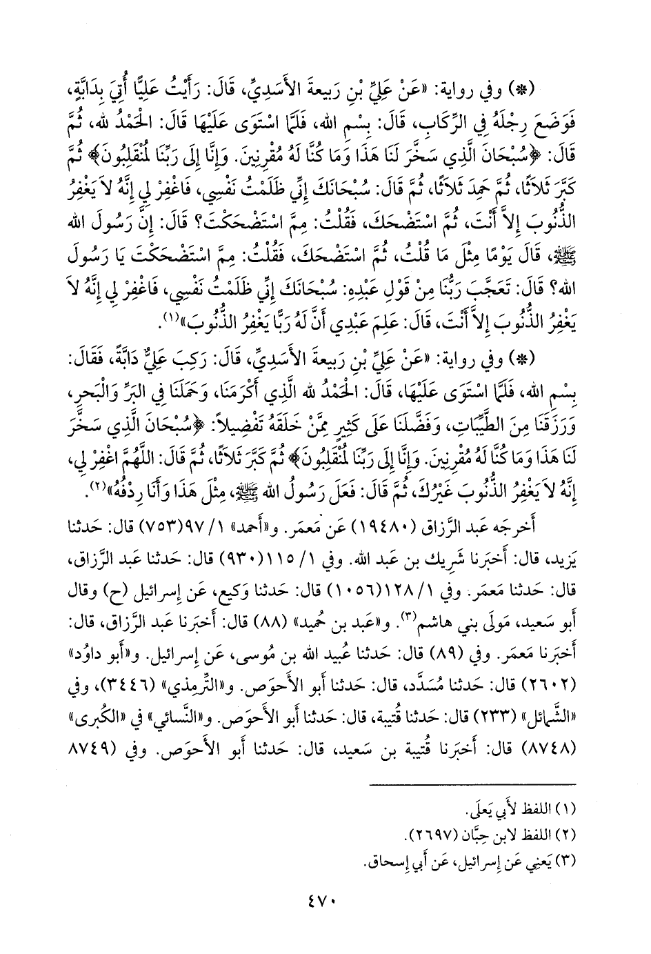 - وفي رواية: «عن علي بن ربيعة الأسدي، قال: ركب علي دابة، فقال: بسم الله، فلما استوى عليها، قال: الحمد لله الذي أكرمنا، وحملنا في البر والبحر، ورزقنا من الطيبات، وفضلنا على كثير ممن خلقه تفضيلا: {سبحان الذي سخر لنا هذا وما كنا له مقرنين. وإنا إلى ربنا لمنقلبون} ثم كبر ثلاثا، ثم قال: اللهم اغفر لي، إنه لا يغفر الذنوب غيرك، ثم قال: فعل رسول الله صَلى الله عَليه وسَلم مثل هذا وأنا ردفه» (¬٢).
