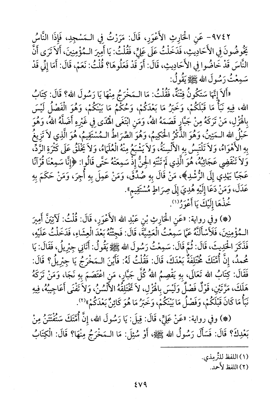 - وفي رواية: «عن الحارث بن عبد الله الأعور، قال: قلت: لآتين أمير المؤمنين، فلأسألنه عما سمعت العشية، قال: فجئته بعد العشاء، فدخلت عليه، فذكر الحديث، قال: ثم قال: سمعت رسول الله صَلى الله عَليه وسَلم يقول: أتاني جبريل، فقال: يا محمد، إن أمتك مختلفة بعدك، قال: فقلت له: فأين المخرج يا جبريل؟ قال: فقال: كتاب الله تعالى، به يقصم الله كل جبار، من اعتصم به نجا، ومن تركه هلك، مرتين، قول فصل وليس بالهزل، لا تختلقه الألسن، ولا تفنى أعاجيبه، فيه نبأ ما كان قبلكم، وفصل ما بينكم، وخبر ما هو كائن بعدكم» (¬٢).