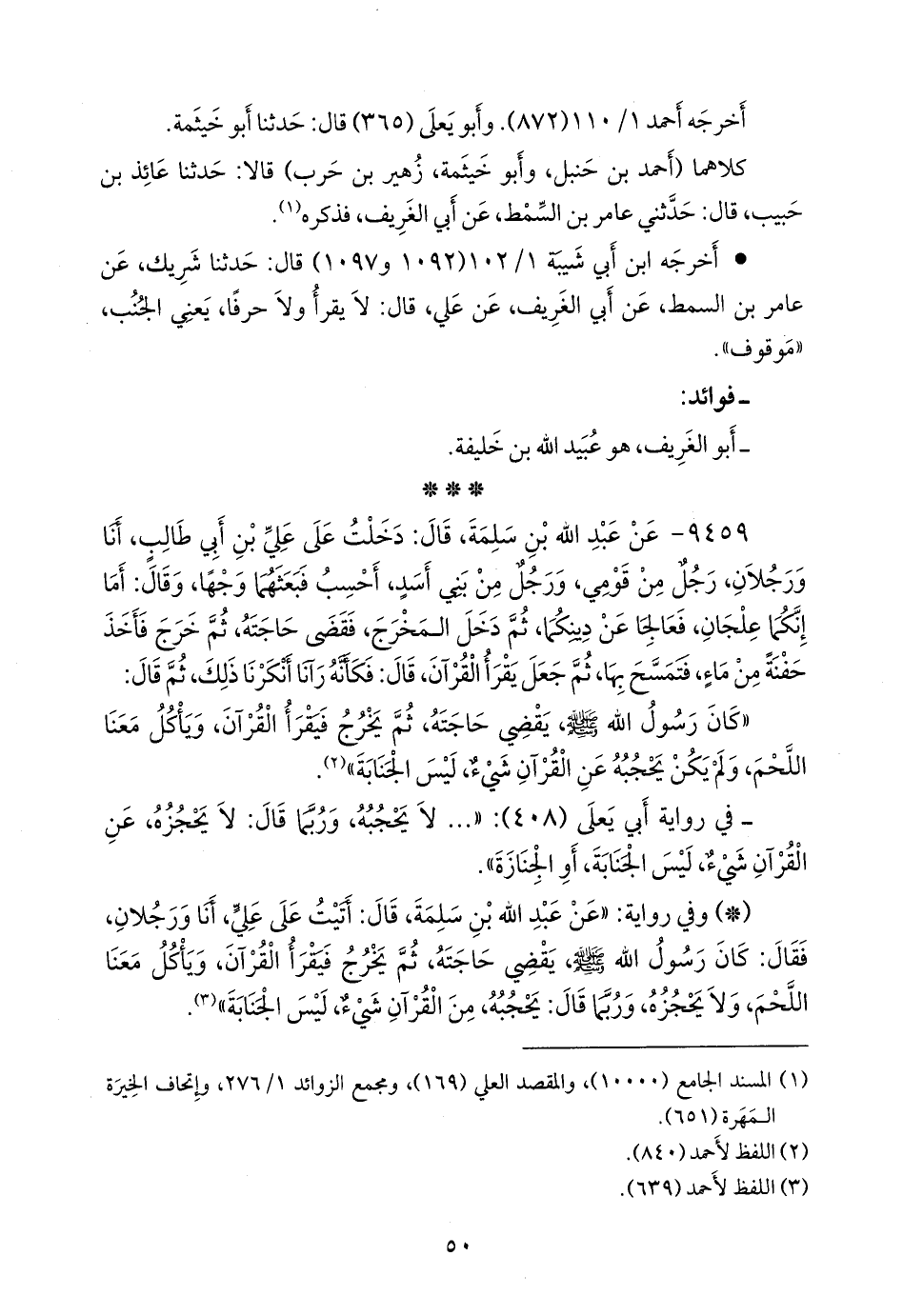 - وفي رواية: «عن عبد الله بن سَلِمة، قال: أتيت على علي، أنا ورجلان، فقال: كان رسول الله صَلى الله عَليه وسَلم يقضي حاجته، ثم يخرج فيقرأ القرآن، ويأكل معنا اللحم، ولا يحجزه، وربما قال: يحجبه، من القرآن شيء، ليس الجنابة» (¬٢).