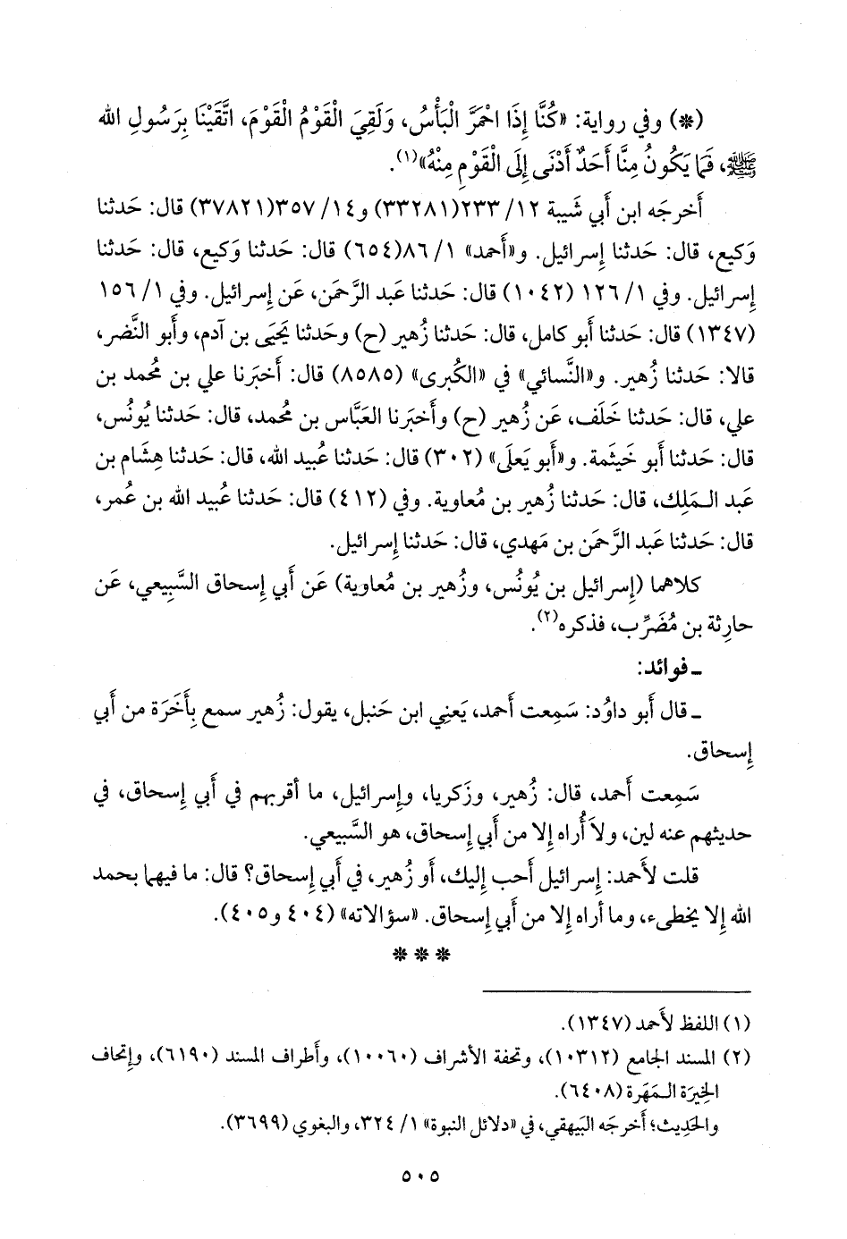 قلت لأحمد: إسرائيل أحب إليك, أو زهير, في أبي إسحاق؟ قال: ما فيهما بحمد الله إلا يخطئ، وما أراه إلا من أبي إسحاق. «سؤالاته» (٤٠٤ و ٤٠٥).