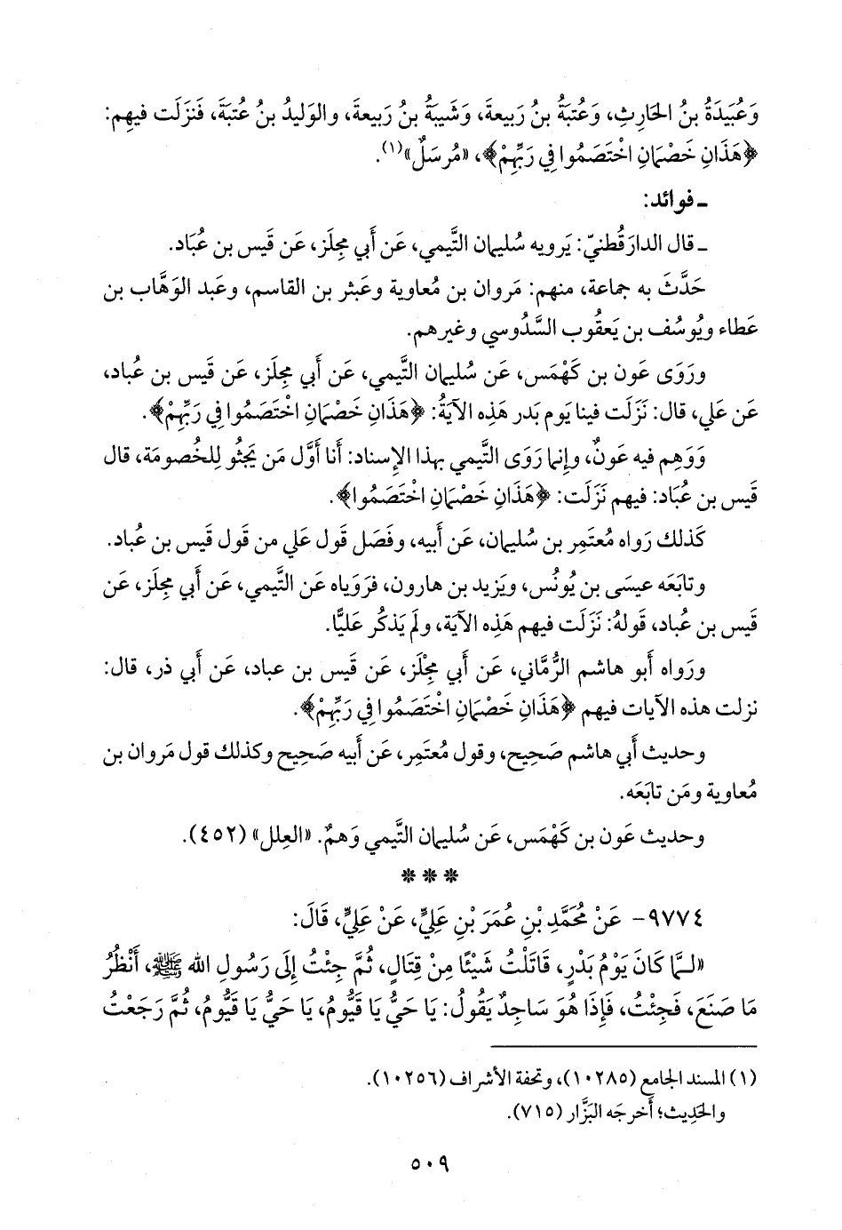- وقال الدارقُطني أيضا: اتفقا، يعني البخاري ومسلما، فأخرجا حديث الثوري، وهُشيم، عن أبي هاشم، عن أبي مجلز، عن قيس بن عُبَاد، عن أبي ذر؛ أنه يقسم قسما، أن صَلى الله عَليه وسَلم هذان خصمان اختصموا}، نزلت في الستة المتبارزين يوم بدر.