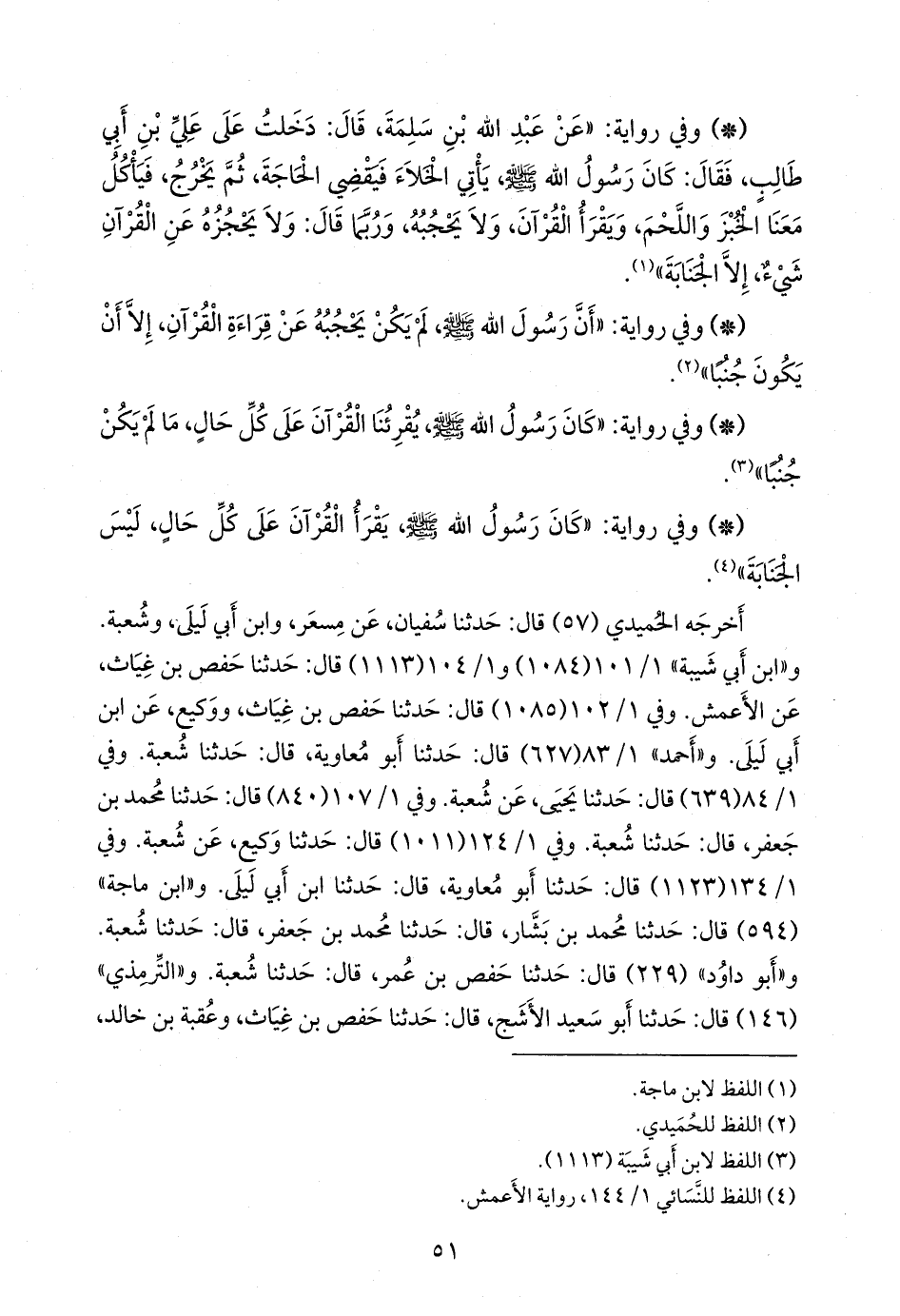 - وفي رواية: «كان رسول الله صَلى الله عَليه وسَلم يقرئنا القرآن على كل حال، ما لم يكن جنبا» (¬١).