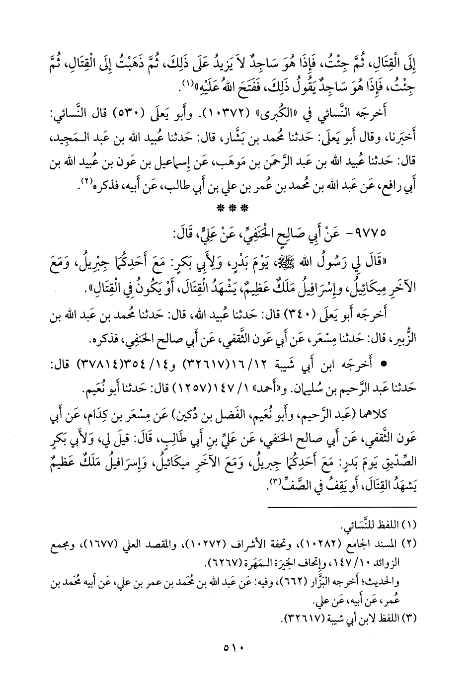 كلاهما (عبد الرحيم، وأَبو نُعيم الفضل بن دُكَين) عن مِسعَر بن كِدَام, عن أبي عون الثقفي, عن أبي صالح الحنفي، عن علي بن أبي طالب, قال: قيل لي, ولأَبي بكر الصِّدِّيق يوم بدر: مع أحدكما جبريل, ومع الآخر ميكائيل, وإسرافيل ملك عظيم يشهد القتال, أو يقف في الصف (¬١).