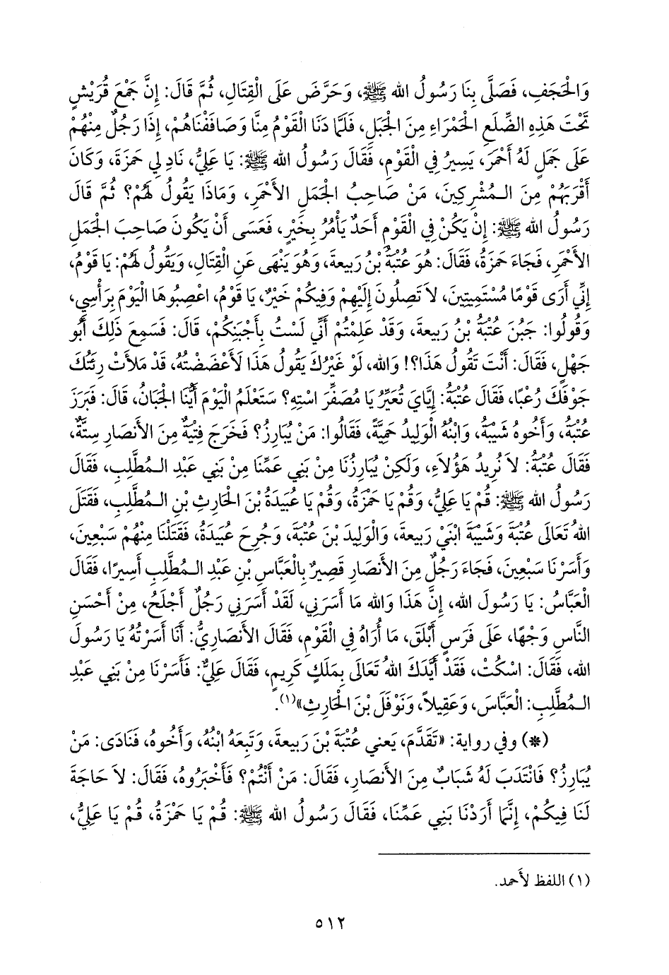 وماذا يقول لهم؟ ثم قال رسول الله صَلى الله عَليه وسَلم: إن يكن في القوم أحد يأمر بخير، فعسى أن يكون صاحب الجمل الأحمر، فجاء حمزة، فقال: هو عتبة بن ربيعة، وهو ينهى عن القتال، ويقول لهم: يا قوم، إني أرى قوما مستميتين، لا تصلون إليهم وفيكم خير، يا قوم، اعصبوها اليوم برأسي، وقولوا: جبن عُتبة بن ربيعة، وقد علمتم أني لست بأجبنكم، قال: فسمع ذلك أَبو جهل، فقال: أنت تقول هذا؟! والله، لو غيرك يقول هذا لأعضضته، قد ملأت رئتك جوفك رعبا، فقال عتبة: إياي تعير يا مصفر استه؟ ستعلم اليوم أينا الجبان، قال: فبرز عتبة، وأخوه شيبة، وابنه الوليد حمية، فقالوا: من يبارز؟ فخرج فتية من الأنصار ستة، فقال عتبة: لا نريد هؤلاء، ولكن يبارزنا من بني عمنا من بني عبد المطلب، فقال رسول الله صَلى الله عَليه وسَلم: قم يا علي، وقم يا حمزة، وقم يا عبيدة بن الحارث بن المطلب، فقتل الله تعالى عتبة وشيبة ابني ربيعة، والوليد بن عُتبة، وجرح عبيدة، فقتلنا منهم سبعين، وأسرنا سبعين، فجاء رجل من الأنصار قصير بالعباس بن عبد المطلب أسيرا، فقال العباس: يا رسول الله، إن هذا والله ما أسرني، لقد أسرني رجل أجلح، من أحسن الناس وجها، على فرس أبلق، ما أراه في القوم، فقال الأَنصاري: أنا أسرته يا رسول الله، فقال: اسكت، فقد أيدك الله تعالى بملك كريم، فقال علي: فأسرنا من بني عبد المطلب: العباس، وعقيلا، ونوفل بن الحارث» (¬١).
