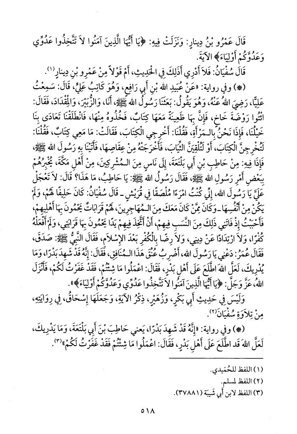 - وفي رواية: «عن عُبيد الله بن أبي رافع، وهو كاتب علي، قال: سمعت عليا، رضي الله عنه، وهو يقول: بعثنا رسول الله صَلى الله عَليه وسَلم أنا، والزبير، والمقداد، فقال: ائتوا روضة خاخ، فإن بها ظعينة معها كتاب، فخذوه منها، فانطلقنا تعادى بنا خيلنا، فإذا نحن بالمرأة، فقلنا: أخرجي الكتاب، فقالت: ما معي كتاب، فقلنا: لتخرجن الكتاب، أو لتلقين الثياب، فأخرجته من عقاصها، فأتينا به رسول الله صَلى الله عَليه وسَلم فإذا فيه: من حاطب بن أبي بلتعة، إلى ناس من المشركين، من أهل مكة، يخبرهم ببعض أمر رسول الله صَلى الله عَليه وسَلم فقال رسول الله صَلى الله عَليه وسَلم: يا حاطب، ما هذا؟ قال: لا تعجل علي يا رسول الله، إني كنت امرءا ملصقا في قريش ـ قال سفيان: كان حليفا لهم، ولم يكن من أنفسها، وكان ممن كان معك من المهاجرين، لهم قرابات يحمون بها أهليهم، فأحببت إذ فاتني ذلك من النسب فيهم، أن أتخذ فيهم يدا يحمون بها قرابتي، ولم أفعله كفرا، ولا ارتدادا عن ديني، ولا رضا بالكفر بعد الإسلام، فقال النبي صَلى الله عَليه وسَلم: صدق، فقال عمر: دعني يا رسول الله، أضرب عنق هذا المنافق، فقال: إنه قد شهد بَدرًا، وما يدريك، لعل الله اطلع على أهل بدر، فقال: اعملوا ما شئتم، فقد غفرت لكم، فأنزل الله، عز وجل: {يا أيها الذين آمنوا لا تتخذوا عدوي وعدوكم أولياء}».