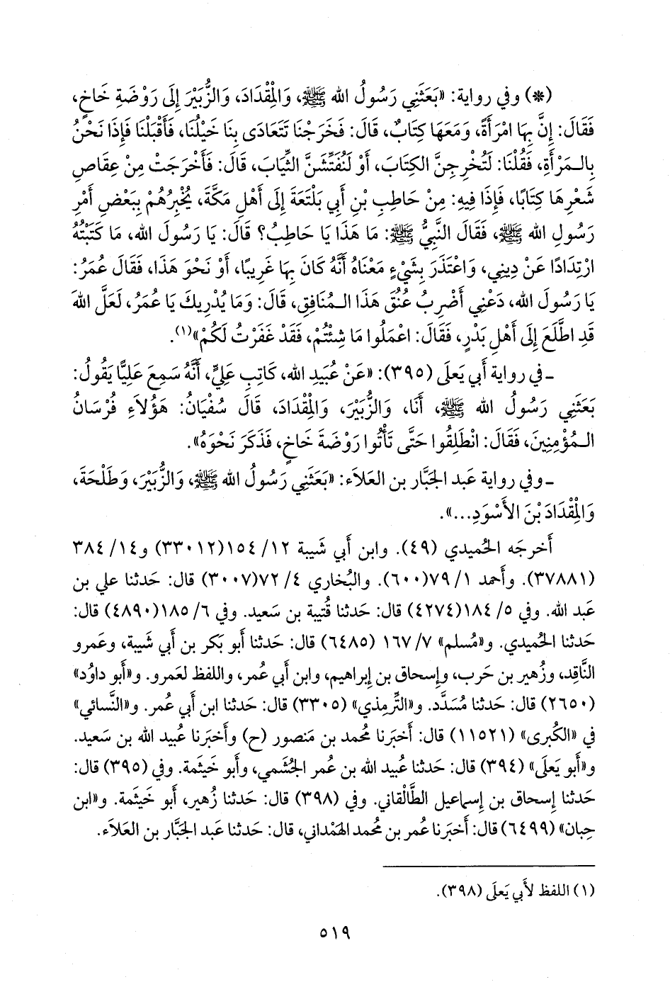 - في رواية أبي يَعلى (٣٩٥): «عن عُبيد الله، كاتب علي، أنه سمع عليا يقول: بعثني رسول الله صَلى الله عَليه وسَلم أنا، والزبير، والمقداد، قال سفيان: هؤلاء فرسان المؤمنين، فقال: انطلقوا حتى تأتوا روضة خاخ، فذكر نحوه».