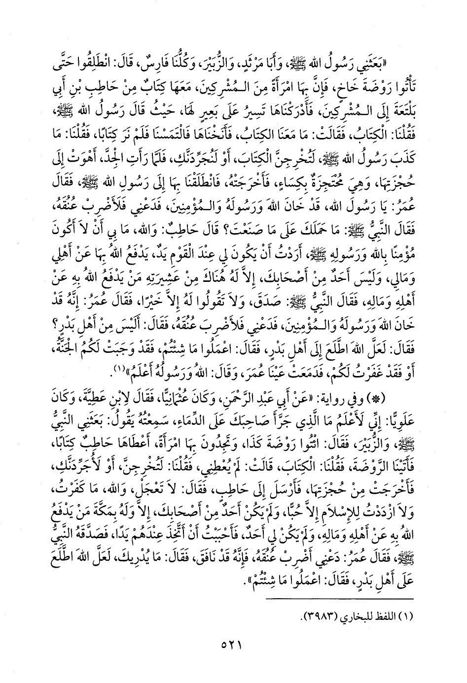 - وفي رواية: «عن أبي عبد الرَّحمَن، وكان عثمانيا، فقال لابن عطية، وكان علويا: إني لأعلم ما الذي جرأ صاحبك على الدماء، سمعته يقول: بعثني النبي صَلى الله عَليه وسَلم والزبير، فقال: ائتوا روضة كذا، وتجدون بها امرأة، أعطاها حاطب كتابا، فأتينا الروضة، فقلنا: الكتاب، قالت: لم يعطني، فقلنا: لتخرجن، أو لأجردنك، فأخرجت من حجزتها، فأرسل إلى حاطب، فقال: لا تعجل، والله، ما كفرت، ولا ازددت للإسلام إلا حبا، ولم يكن أحد من أصحابك، إلا وله بمكة من يدفع الله به عن أهله وماله، ولم يكن لي أحد، فأحببت أن أتخذ عندهم يدا، فصدقه النبي صَلى الله عَليه وسَلم فقال عمر: دعني أضرب عنقه، فإنه قد نافق، فقال: ما يدريك، لعل الله اطلع على أهل بدر، فقال: اعملوا ما شئتم».