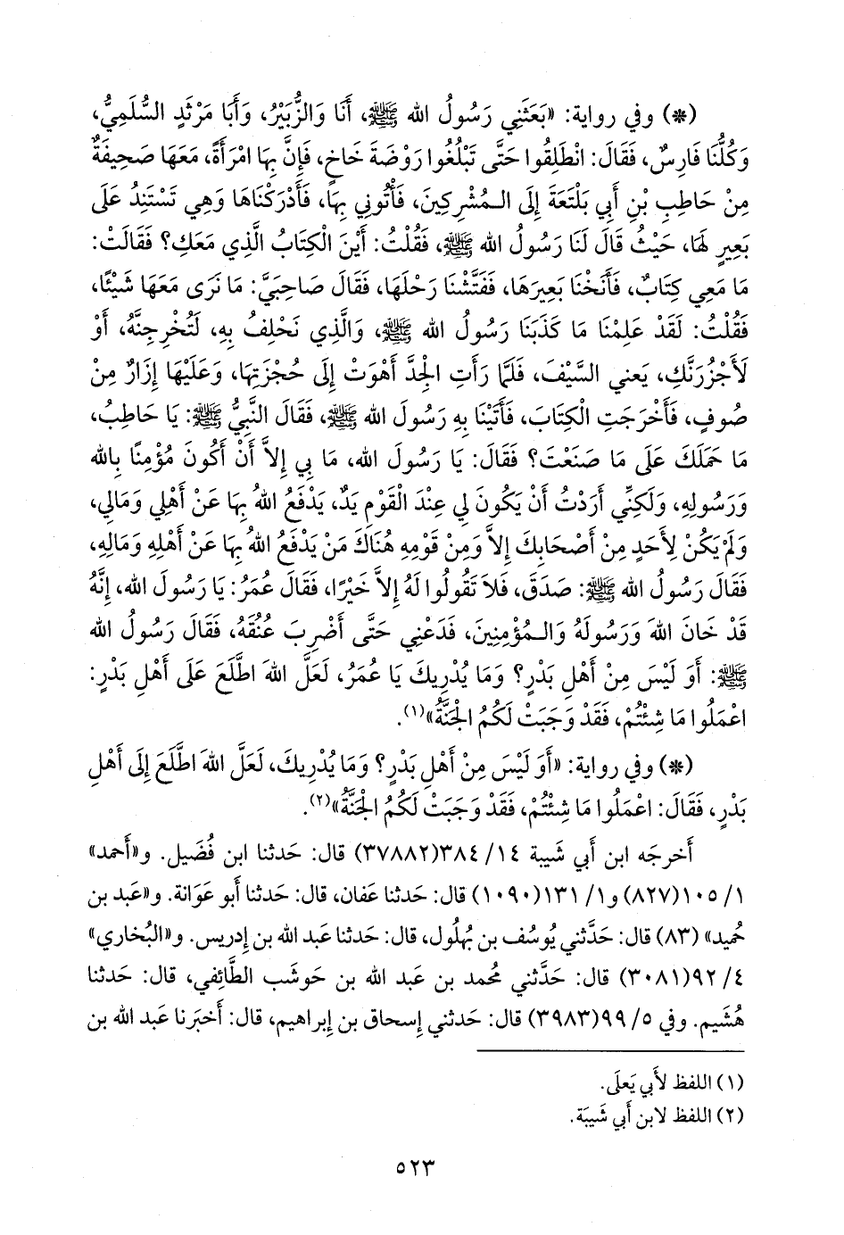 - وفي رواية: «بعثني رسول الله صَلى الله عَليه وسَلم أنا والزبير، وأبا مَرثد السلمي، وكلنا فارس، فقال: انطلقوا حتى تبلغوا روضة خاخ، فإن بها امرأة، معها صحيفة من حاطب بن أبي بلتعة إلى المشركين، فأتوني بها، فأدركناها وهي تستند على بعير لها، حيث قال لنا رسول الله صَلى الله عَليه وسَلم فقلت: أين الكتاب الذي معك؟ فقالت: ما معي كتاب، فأنخنا بعيرها، ففتشنا رحلها، فقال صاحبي: ما نرى معها شيئا، فقلت: لقد علمنا ما كذبنا رسول الله صَلى الله عَليه وسَلم والذي نحلف به، لتخرجنه، أو لأجزرنك، يعني السيف، فلما رأت الجد أهوت إلى حجزتها، وعليها إزار من صوف، فأخرجت الكتاب، فأتينا به رسول الله صَلى الله عَليه وسَلم فقال النبي صَلى الله عَليه وسَلم: يا حاطب، ما حملك على ما صنعت؟ فقال: يا رسول الله، ما بي إلا أن أكون مؤمنا بالله ورسوله، ولكني أردت أن يكون لي عند القوم يد، يدفع الله بها عن أهلي ومالي، ولم يكن لأحد من أصحابك إلا ومن قومه هناك من يدفع الله بها عن أهله وماله، فقال رسول الله صَلى الله عَليه وسَلم: صدق، فلا تقولوا له إلا خيرا، فقال عمر: يا رسول الله، إنه قد خان الله ورسوله والمؤمنين، فدعني حتى أضرب عنقه، فقال رسول الله صَلى الله عَليه وسَلم: أو ليس من أهل بدر؟ وما يدريك يا عمر، لعل الله اطلع على أهل بدر: اعملوا ما شئتم، فقد وجبت لكم الجنة» (¬١).