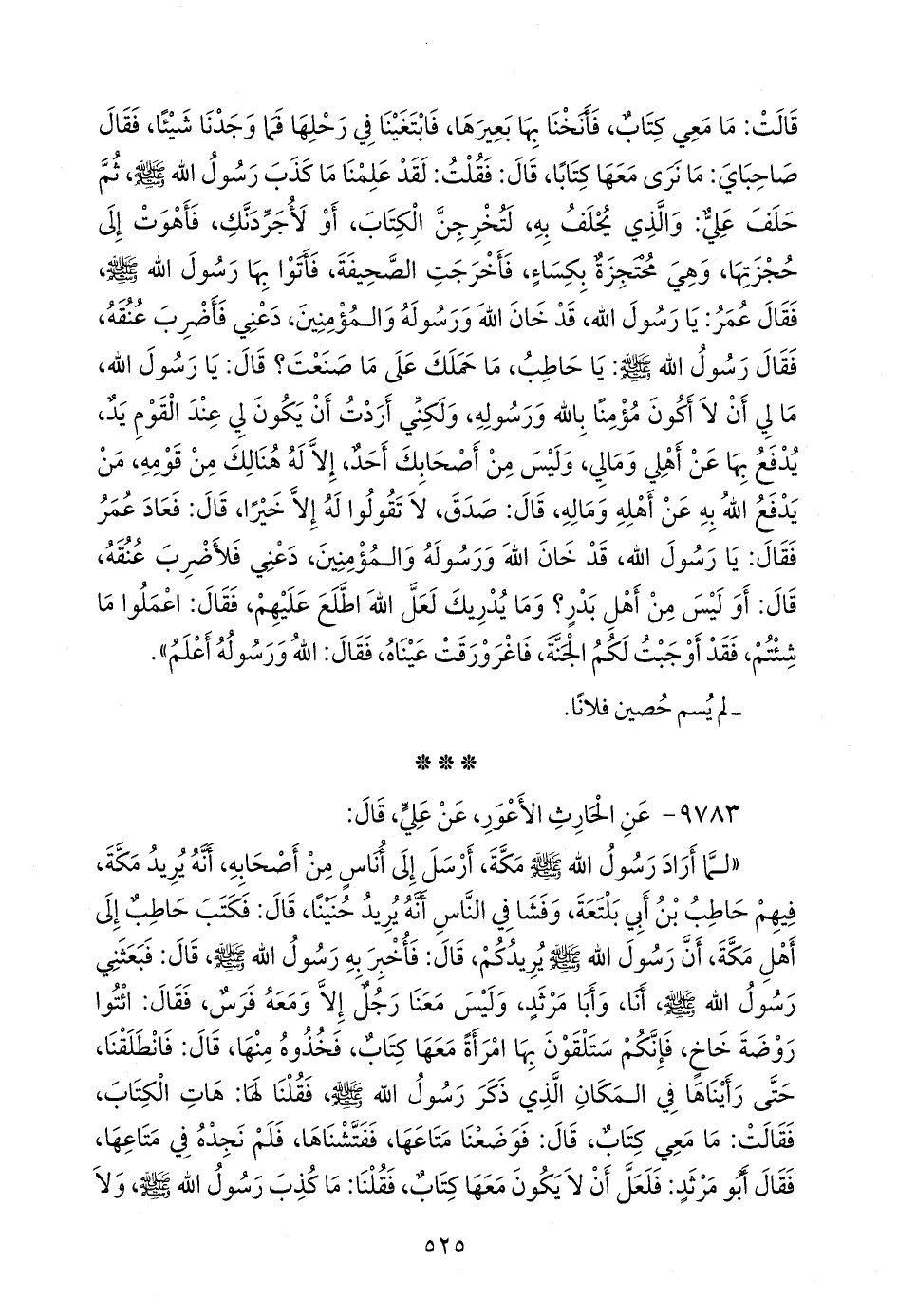 «لما أَراد رسول الله صَلى الله عَليه وسَلم مكة، أَرسل إِلى أُناس من أَصحابه، أَنه يريد مكة فيهم حاطب بن أَبي بلتعة، وفشا في الناس أَنه يريد حنينا، قال: فكتب حاطب إِلى أَهل مكة، أَن رسول الله صَلى الله عَليه وسَلم يريدكم، قال: فأُخبر به رسول الله صَلى الله عَليه وسَلم قال: فبعثني رسول الله صَلى الله عَليه وسَلم أَنا، وأَبا مرثد، وليس معنا رجل إِلا ومعه فرس، فقال: ائتوا روضة خاخ، فإِنكم ستلقون بها امرأَة معها كتاب، فخذوه منها، قال: فانطلقنا، حتى رأَيناها في المكان الذي ذكر رسول الله صَلى الله عَليه وسَلم فقلنا لها: هات الكتاب، فقالت: ما معي كتاب، قال: فوضعنا متاعها، ففتشناها، فلم نجده في متاعها، فقال أَبو مرثد: فلعل أَلا يكون معها كتاب، فقلنا: ما كذب رسول الله صَلى الله عَليه وسَلم ولا