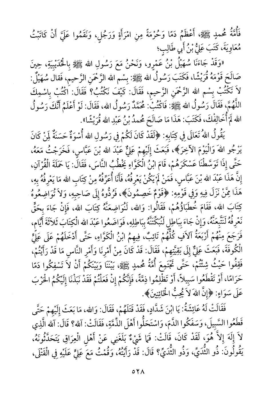 يقول الله تعالى في كتابه: {لقد كان لكم في رسول الله أسوة حسنة لمن كان يرجو الله واليوم الآخر}، فبعث إليهم علي عبد الله بن عباس، فخرجت معه، حتى إذا توسطنا عسكرهم، قام ابن الكواء يخطب الناس، فقال: يا حملة القرآن، إن هذا عبد الله بن عباس، فمن لم يكن يعرفه، فأنا أعرفه من كتاب الله ما يعرفه به، هذا ممن نزل فيه وفي قومه: {قوم خصمون}، فردوه إلى صاحبه، ولا تواضعوه كتاب الله، فقام خطباؤهم، فقالوا: والله، لنواضعنه كتاب الله، فإن جاء بحق نعرفه لنتبعنه، وإن جاء بباطل لنبكتنه بباطله، فواضعوا عبد الله الكتاب ثلاثة أيام، فرجع منهم أربعة آلاف كلهم تائب، فيهم ابن الكواء، حتى أدخلهم على علي الكوفة، فبعث علي إلى بقيتهم، فقال: قد كان من أمرنا وأمر الناس ما قد رأيتم، فقفوا حيث شئتم، حتى تجتمع أمة محمد صَلى الله عَليه وسَلم بيننا وبينكم أن لا تسفكوا دما حراما، أو تقطعوا سبيلا، أو تظلموا ذمة، فإنكم إن فعلتم فقد نبذنا إليكم الحرب على سواء: {إن الله لا يحب الخائنين}.