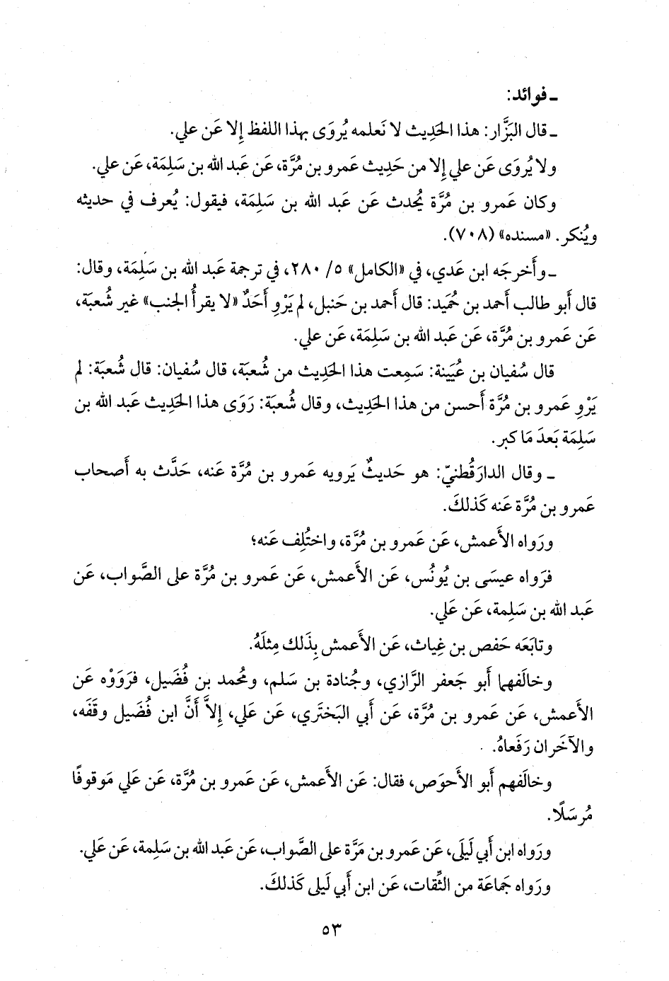 - وأخرجه ابن عَدي في «الكامل» ٥/ ٢٨٠، في مناكير عبد الله بن سَلِمة، وقال: قال أَبو طالب أحمد بن حميد: قال أحمد بن حنبل، لم يرو أحد «لا يقرأ الجنب» غير شعبة، عن عَمرو بن مُرَّة، عن عبد الله بن سَلِمة، عن علي.