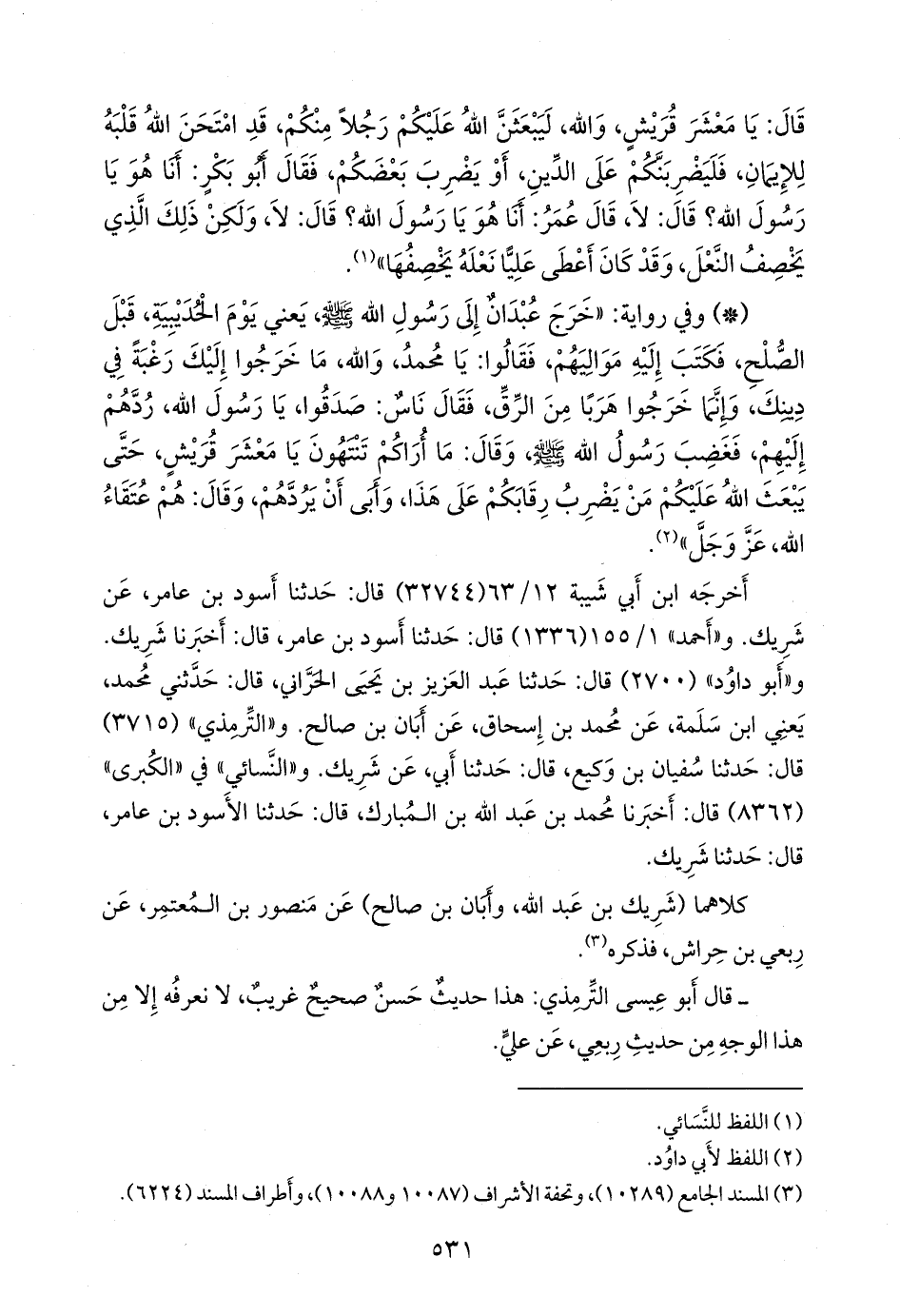 أخرجه ابن أبي شيبة (٣٢٧٤٤) قال: حدثنا أسود بن عامر، عن شَريك. و «أحمد» (١٣٣٦) قال: حدثنا أسود بن عامر، قال: أخبرنا شريك. و «أَبو داود» (٢٧٠٠) قال: حدثنا عبد العزيز بن يحيى الحراني، قال: حدثني محمد، يعني ابن سلمة, عن محمد بن إسحاق, عن أَبَان بن صالح. و «التِّرمِذي» (٣٧١٥) قال: حدثنا سفيان بن وكيع، قال: حدثنا أبي, عن شَريك. و «النَّسَائي» في «الكبرى» (٨٣٦٢) قال: أخبرنا محمد بن عبد الله بن المبارك، قال: حدثنا الأسود بن عامر، قال: حدثنا شَريك.