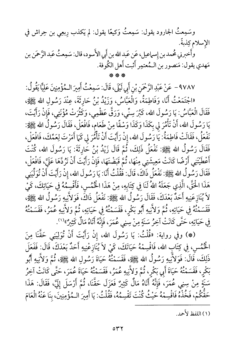 «اجتمعت أنا، وفاطمة، والعباس، وزيد بن حارثة، عند رسول الله صَلى الله عَليه وسَلم فقال العباس: يا رسول الله، كبر سني، ورق عظمي، وكثرت مؤنتي، فإن رأيت، يا رسول الله، أن تأمر لي بكذا وكذا وسقا من طعام، فافعل، فقال رسول الله صَلى الله عَليه وسَلم: نفعل، فقالت فاطمة: يا رسول الله، إن رأيت أن تأمر لي كما أمرت لعمك، فافعل، فقال رسول الله صَلى الله عَليه وسَلم: نفعل ذلك، ثم قال زيد بن حارثة: يا رسول الله، كنت أعطيتني أرضا كانت معيشتي منها، ثم قبضتها، فإن رأيت أن تردها علي، فافعل، فقال رسول الله صَلى الله عَليه وسَلم: نفعل ذاك، قال: فقلت أنا: يا رسول الله، إن رأيت أن توليني هذا الحق، الذي جعله الله لنا في كتابه، من هذا الخمس، فأقسمه في حياتك، كي لا ينازعنيه أحد بعدك، فقال رسول الله صَلى الله عَليه وسَلم: نفعل ذاك، فولانيه رسول الله صَلى الله عَليه وسَلم فقسمته في حياته، ثم ولانيه أَبو بكر، فقسمته في حياته، ثم ولانيه عمر، فقسمته في حياته، حتى كانت آخر سنة من سني عمر، فإنه أتاه مال كثير» (¬١).