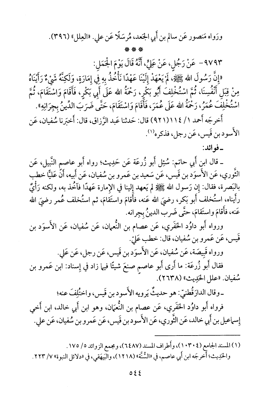- قال عبد الرَّحمَن بن أبي حاتم الرازي: سئل أَبو زُرعَة عن حديث؛ رواه أَبو عاصم النبيل، عن الثوري، عن الأسود بن قيس، عن سعيد بن عَمرو بن سفيان، عن أبيه، أن عليا خطب بالبصرة، فقال: إن رسول الله صَلى الله عَليه وسَلم لم يعهد إلينا في الإمارة عهدا فآخذ به، ولكنه رأي رأيناه، استخلف أَبو بكر، رضي الله عنه، فأقام واستقام، ثم استخلف عمر رضي الله عنه، فأقام واستقام، حتى ضرب الدين بجرانه.