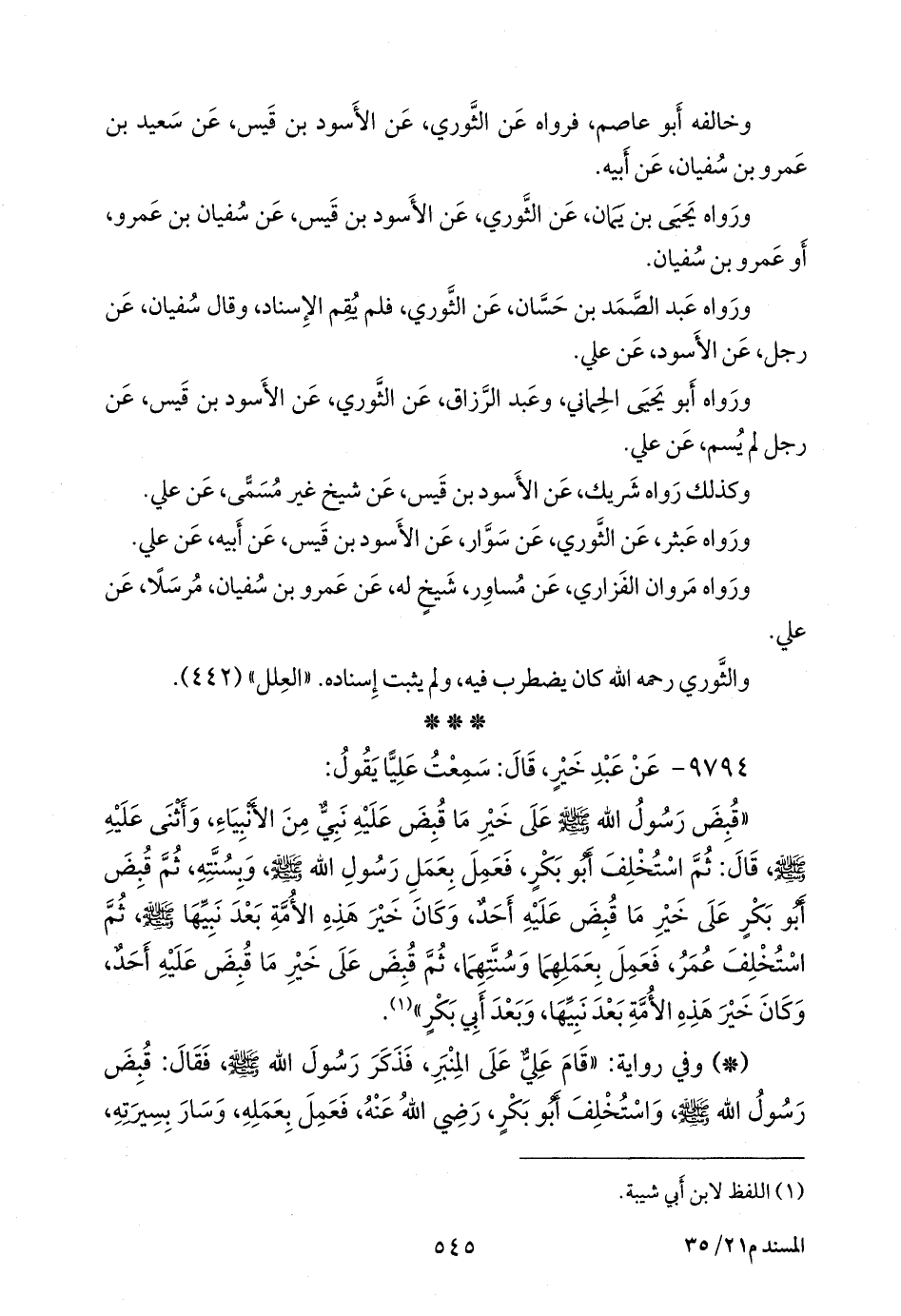 أخرجه ابن أبي شيبة (٣٨٢٠٨) قال: حدثنا ابن نُمير. و «عبد الله بن أحمد» ١/ ١٢٨ (١٠٥٥) قال: حدثني سريج بن يونس، قال: حدثنا مروان الفزاري. وفي (١٠٥٩) قال: حدثنا أَبو بكر بن أبي شيبة، قال: حدثنا ابن نُمير.