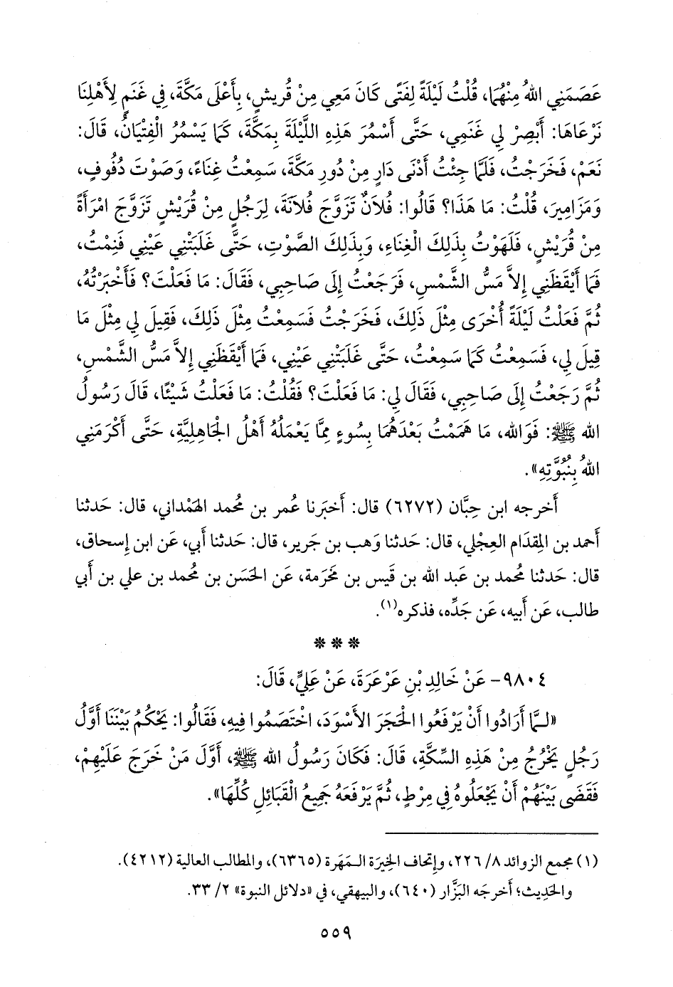 «لما أرادوا أن يرفعوا الحجر الأسود، اختصموا فيه، فقالوا: يحكم بيننا أول رجل يخرج من هذه السكة, قال: فكان رسول الله صَلى الله عَليه وسَلم أول من خرج عليهم, فقضى بينهم أن يجعلوه في مرط، ثم يرفعه جميع القبائل كلها».