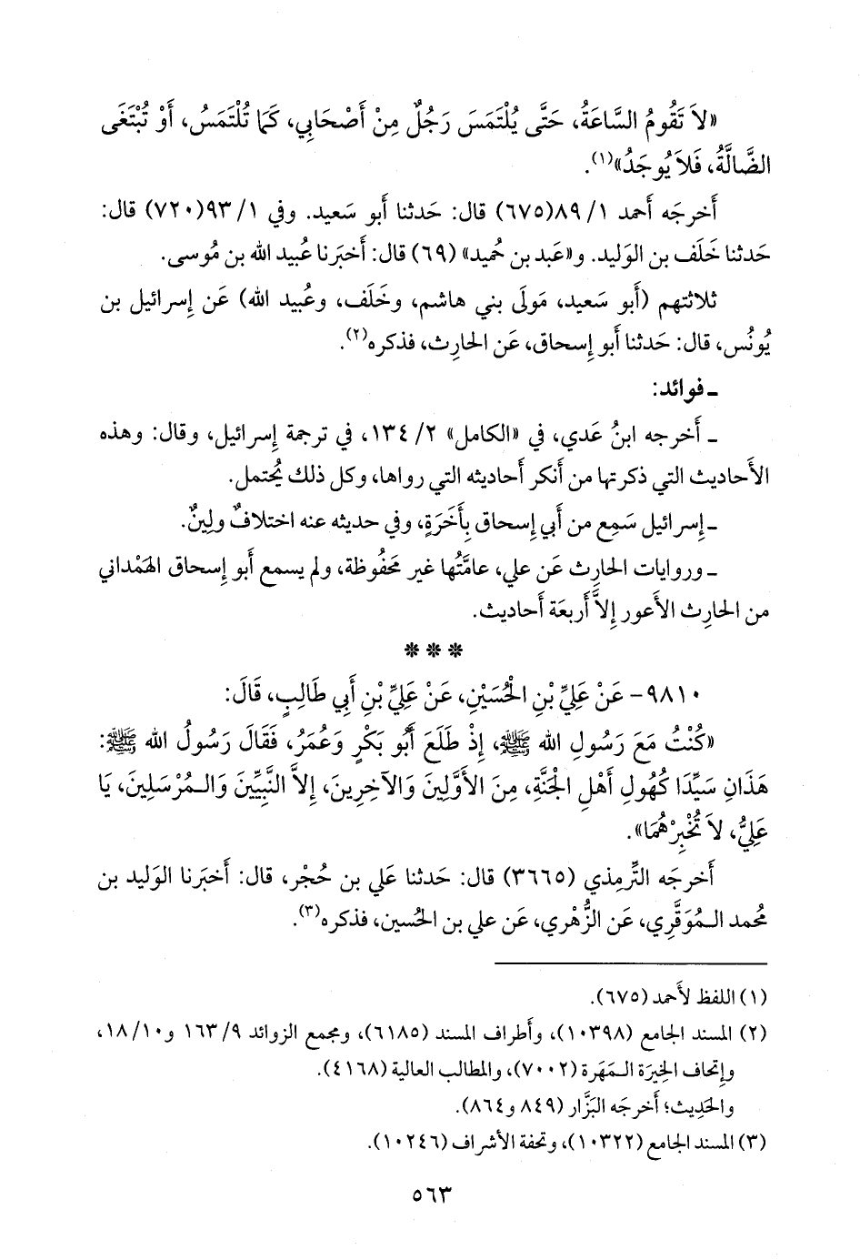 (¬٢) ما بين القوسين لم يرد في نسخة الكروخي الخطية، الورقة (٢٤٩/ أ)، وطبعة دار الغرب، والمثبت عن طبعتي المكنز (٤٠٢٧)، والرسالة (٣٩٩٥)، وكتب محقق الرسالة: قوله: «ولم يسمع علي بن الحسين من علي بن أبي طالب» أثبتناه من (س) يعني «نسخة تشستربتي»، ولم يرد في سائر أصولنا الخطية.
