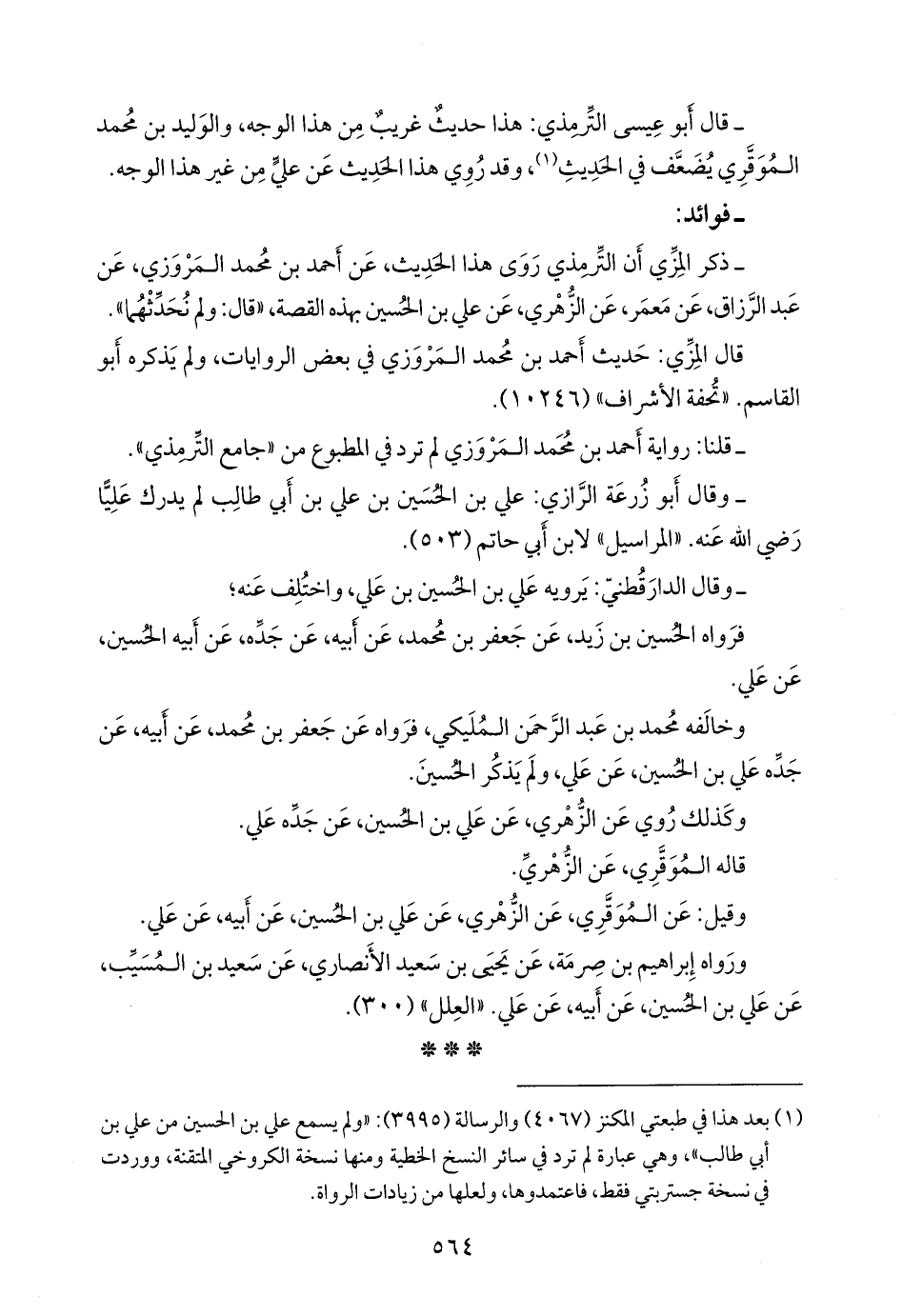 - ذكر المِزِّي أن التِّرمِذي روى هذا الحديث، عن أحمد بن محمد المَرْوَزي، عن عبد الرزاق، عن مَعمَر، عن الزُّهْري، عن علي بن الحسين بهذه القصة، «قال: ولم نحدثهما».