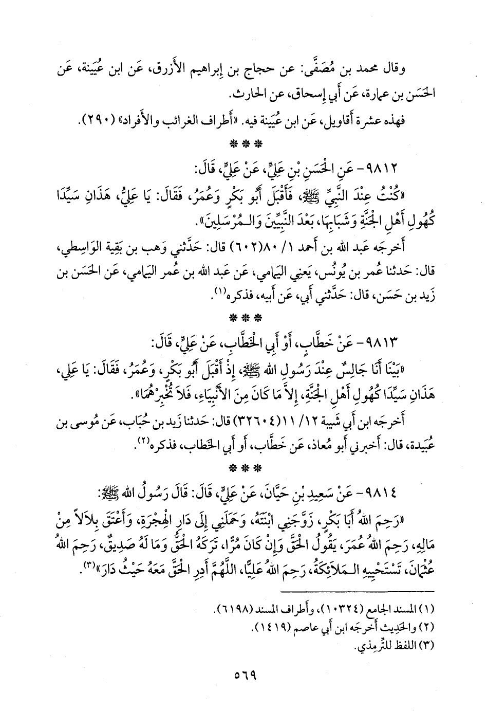 «بينا أنا جالس عند رسول الله صَلى الله عَليه وسَلم إذ أقبل أَبو بكر, وعمر, فقال: يا علي, هذان سيدا كهول أهل الجنة، إلا ما كان من الأنبياء، فلا تخبرهما».