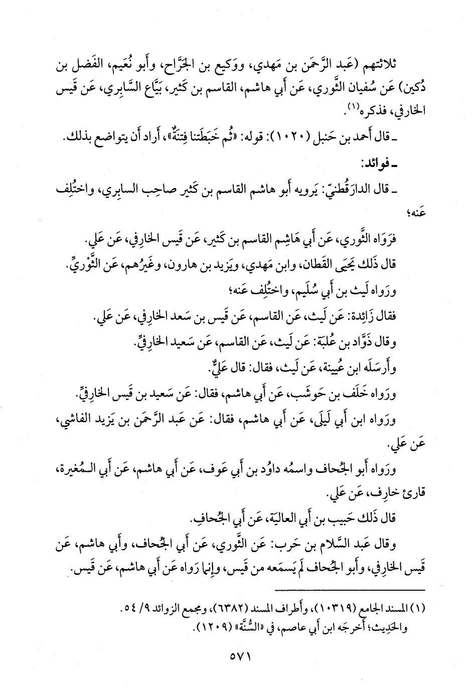 وقال عبد السلام بن حرب: عن الثوري، عن أبي الجحاف، وأبي هاشم، عن قيس الخارفي، وأَبو الجحاف لم يسمعه من قيس، وإنما رواه عن أبي هاشم، عن قيس.