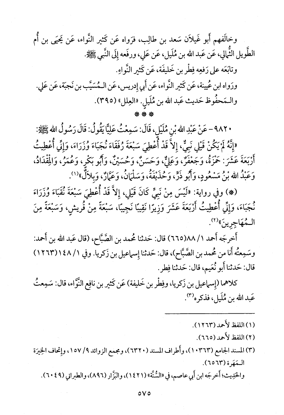 • وأخرجه أحمد (١٢٧٤) قال: حدثنا معاوية بن هشام، قال: حدثنا سفيان، عن سالم بن أبي حفصة، قال: بلغني عن عبد الله بن مليل، فغدوت إليه، فوجدتهم في جِنازة، فحدثني رجل، عن عبد الله بن مليل، قال: سمعت عليا يقول: أعطي كل نبي سبعة نجباء، وأعطي نبيكم أربعة عشر نجيبا، منهم أَبو بكر، وعمر، وعبد الله بن مسعود، وعمار بن ياسر. «موقوف» (¬١).