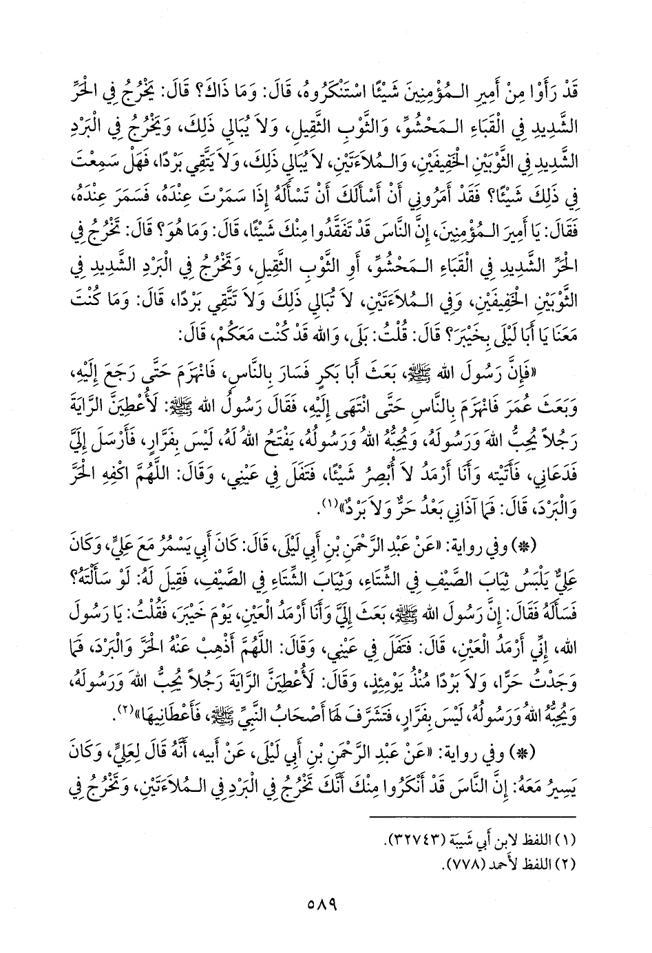 - وفي رواية: «عن عبد الرَّحمَن بن أبي ليلى، عن أبيه، أنه قال لعلي، وكان يسير معه: إن الناس قد أنكروا منك أنك تخرج في البرد في الملاءتين، وتخرج في