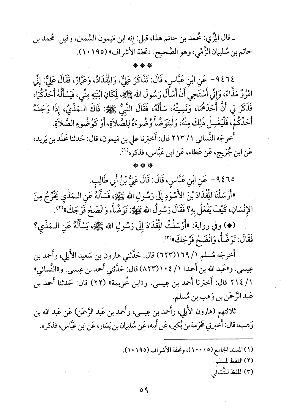 «أرسل علي بن أبي طالب، رضي الله عنه، المقداد إلى رسول الله صَلى الله عَليه وسَلم يسأله عن الرجل يجد المذي؟ فقال رسول الله صَلى الله عَليه وسَلم: يغسل ذكره، ثم ليتوضأ» «مُرسَل» (¬٣).