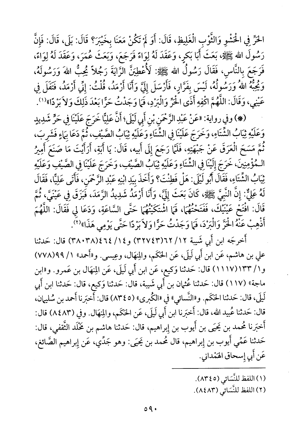 - وفي رواية: «عن عبد الرَّحمَن بن أبي ليلى؛ أن عليا خرج علينا في حر شديد وعليه ثياب الشتاء، وخرج علينا في الشتاء وعليه ثياب الصيف، ثم دعا بماء فشرب، ثم مسح العرق عن جبهته، فلما رجع إلى أبيه، قال: يا أبة، أرأيت ما صنع أمير المؤمنين، خرج إلينا في الشتاء وعليه ثياب الصيف، وخرج علينا في الصيف وعليه ثياب الشتاء، فقال أَبو ليلى: هل فطنت؟ وأخذ بيد ابنه عبد الرَّحمَن، فأتى عليا، فقال له علي: إن النبي صَلى الله عَليه وسَلم كان بعث إلي، وأنا أرمد شديد الرمد، فبزق في عيني، ثم قال: افتح عينيك، ففتحتهما، فما اشتكيتهما حتى الساعة، ودعا لي فقال: اللهم أذهب عنه الحر والبرد، فما وجدت حرا ولا بردا حتى يومي هذا» (¬١).
