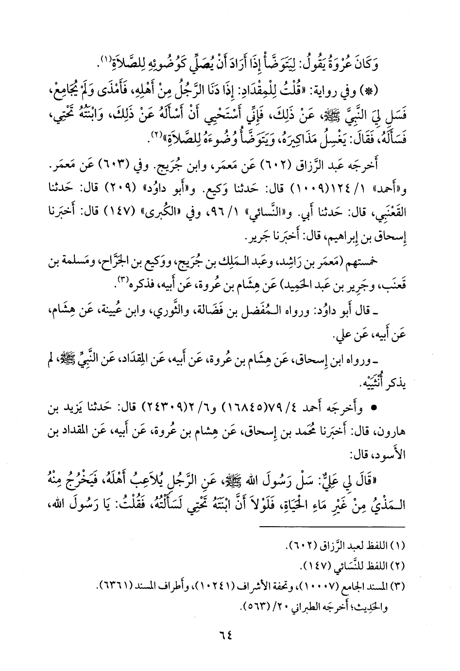 - ورواه ابن إسحاق، عن هشام بن عروة، عن أبيه، عن المقداد، عن النبي صَلى الله عَليه وسَلم لم يذكر أنثييه.