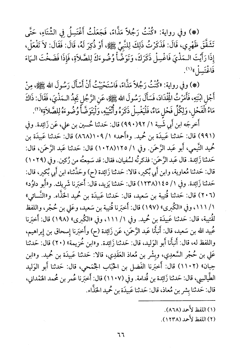 وفي ١/ ١٢٥ (١٠٢٨) قال: حدثنا عبد الرَّحمَن، قال: حدثنا زائدة. قال عبد الرَّحمَن: فذكرته لسفيان، فقال: قد سمعته من ركين. وفي (١٠٢٩) قال: حدثنا معاوية، وابن أبي بكير، قالا: حدثنا زائدة (ح) وحدثناه ابن أبي بكير، قال: حدثنا زائدة. وفي ١/ ١٤٥ (١٢٣٨) قال: حدثنا يزيد، قال: أخبرنا شريك. و «أَبو داود» (٢٠٦) قال: حدثنا قتيبة بن سعيد، قال: حدثنا عَبيدة بن حُميد الحذاء. و «النَّسَائي» ١/ ١١١، وفي «الكبرى» (١٩٧) قال: أخبرنا قتيبة بن سعيد، وعلي بن حُجْر، واللفظ لقتيبة, قال: حدثنا عَبيدة بن حُميد. وفي ١/ ١١١، وفي «الكبرى» (١٩٨) قال: أخبرنا عُبيد الله بن سعيد، قال: أنبأنا عبد الرَّحمَن، عن زائدة (ح) وأخبرنا إسحاق بن إبراهيم، واللفظ له, قال: أنبأنا أَبو الوليد، قال: حدثنا زائدة. و «ابن خزيمة» (٢٠) قال: حدثنا علي بن حُجْر السعدي، وبشر بن معاذ العَقَدي، قالا: حدثنا عَبيدة بن حُميد. و «ابن حِبَّان» (١١٠٢) قال: أخبرنا الفضل بن الحُبَاب الجُمحي، قال: حدثنا أَبو الوليد الطيالسي، قال: حدثنا زائدة بن قُدَامة. وفي (١١٠٧) قال: أخبرنا عمر بن محمد الهمداني، قال: حدثنا بشر بن معاذ، قال: حدثنا عَبيدة بن حُميد الحذاء.