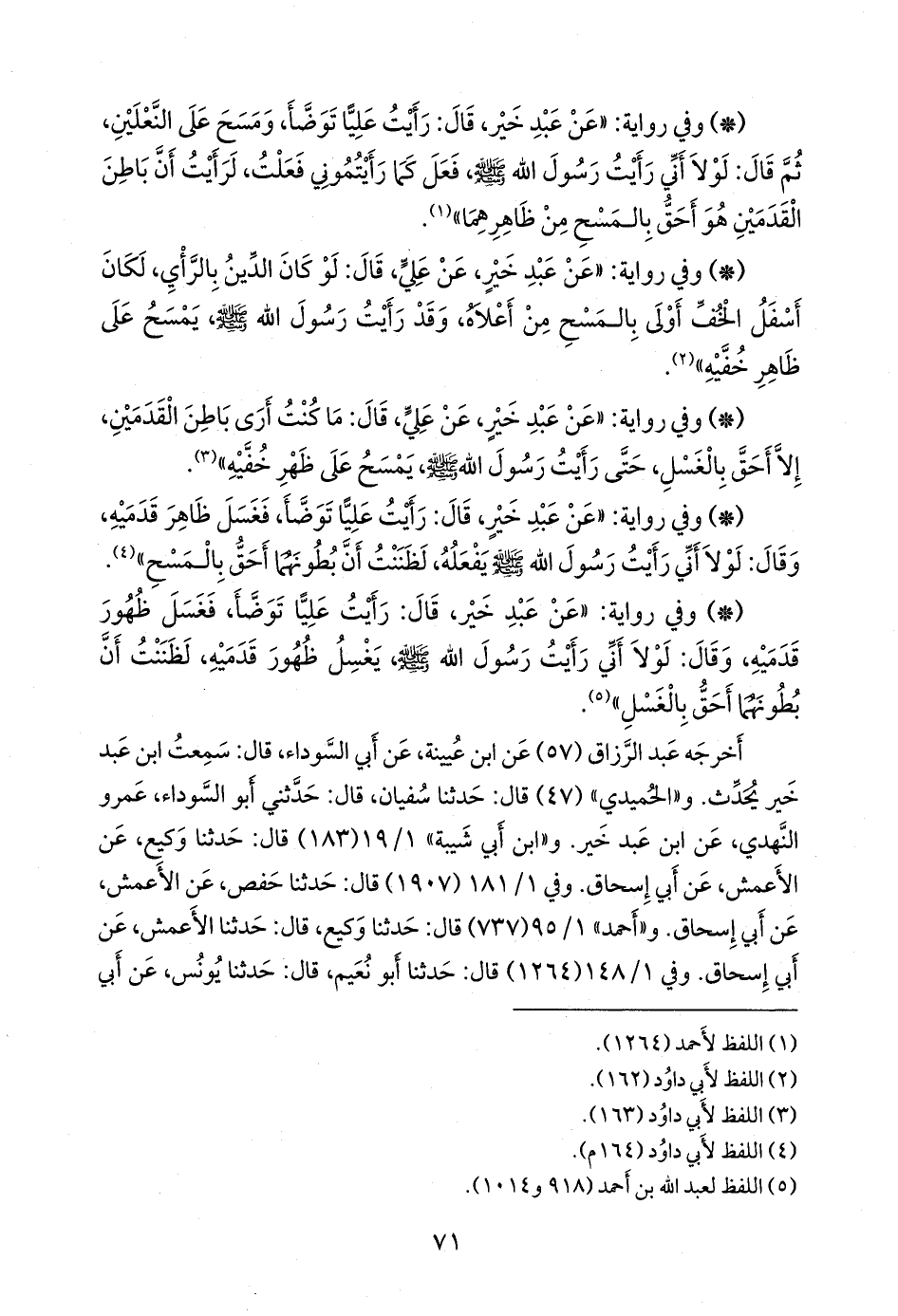 - وفي رواية: «عن عبد خير، قال: رأيت عليا توضأ، فغسل ظهور قدميه، وقال: لولا أني رأيت رسول الله صَلى الله عَليه وسَلم يغسل ظهور قدميه، لظننت أن بطونهما أحق بالغسل» (¬٣).