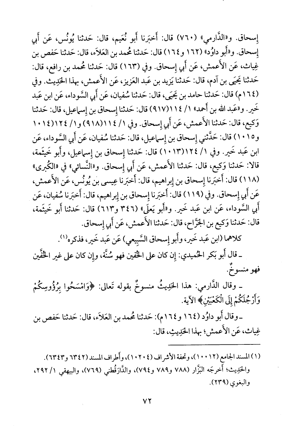 ـ قال أَبو بكر الحميدي: إن كان على الخفين فهو سنة، وإن كان على غير الخفين فهو منسوخ.