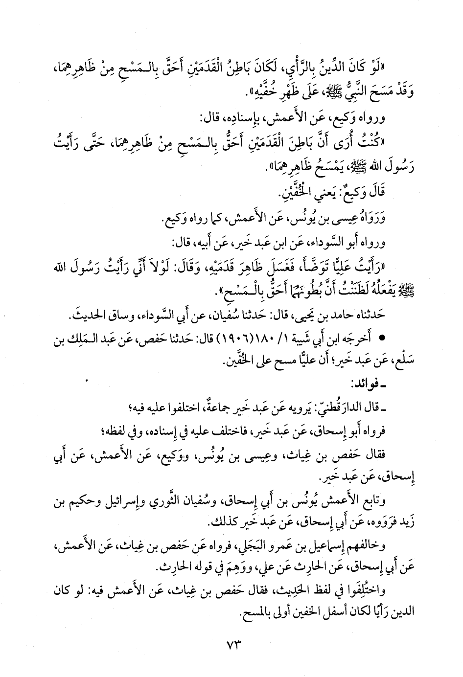 وقال عيسى بن يونس، ووكيع، عن الأعمش فيه: كنت أرى أن باطن القدمين أحق بالمسح من أعلاه.