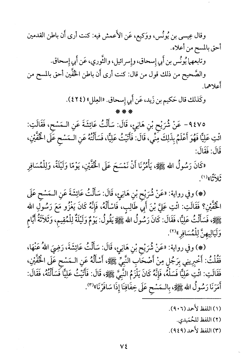 - وفي رواية: «عن شريح بن هانئ، قال: سألت عائشة عن المسح على الخفين، فقالت: ائت عليا فسله، قال: فأتيته، فقال: كان النبي صَلى الله عَليه وسَلم يأمرنا إذا سافرنا أن نمسح على خفافنا ـ قال أسود في حديثه: وربما قال شريك: كنا إذا كنا مع النبي صَلى الله عَليه وسَلم في سفر، مسحنا على خفافنا».