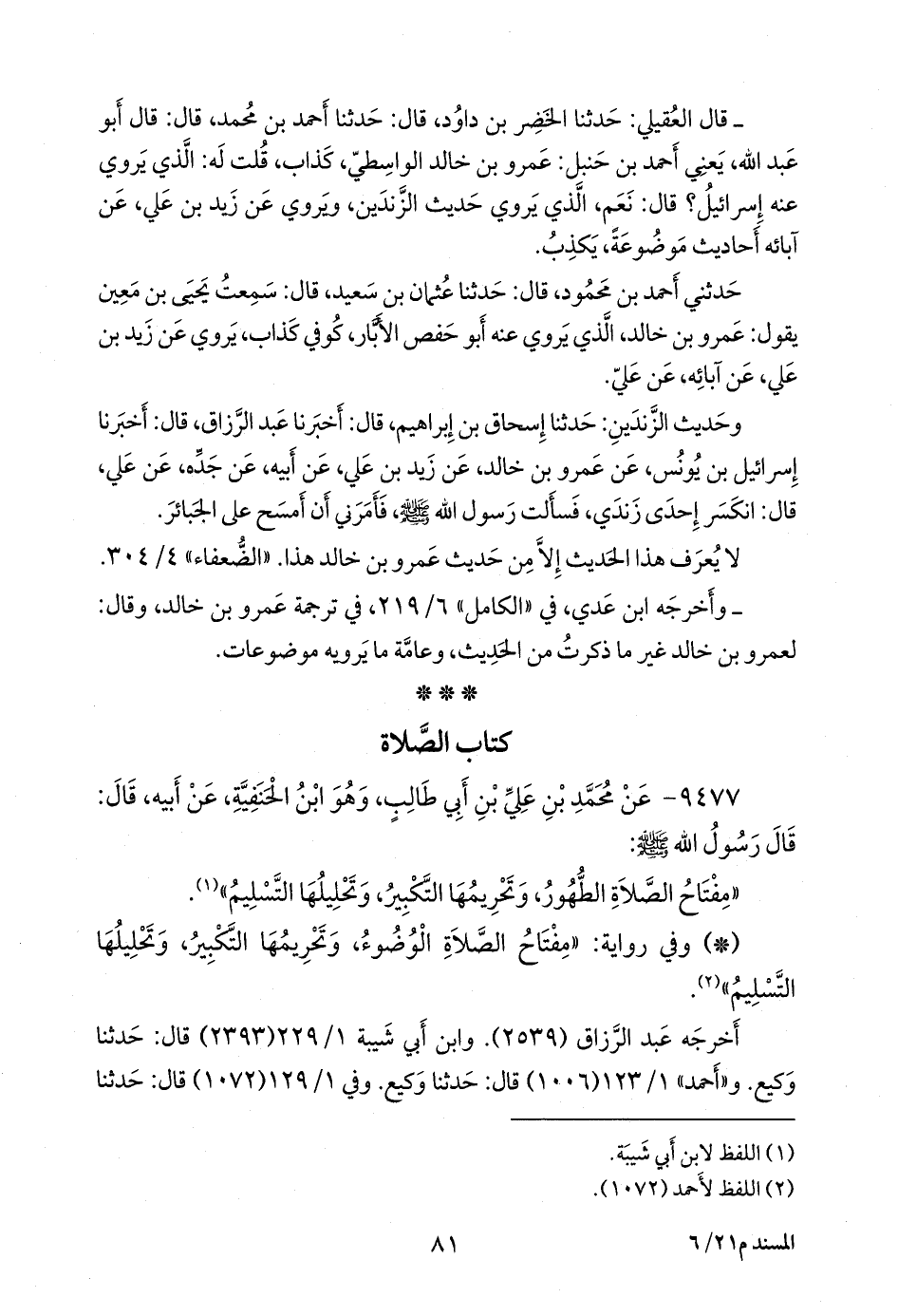 أخرجه عبد الرزاق (٢٥٣٩). وابن أبي شَيبة (٢٣٩٣) قال: حدثنا وكيع. و «أحمد» (١٠٠٦) قال: حدثنا وكيع. وفي ١/ ١٢٩ (١٠٧٢) قال: حدثنا