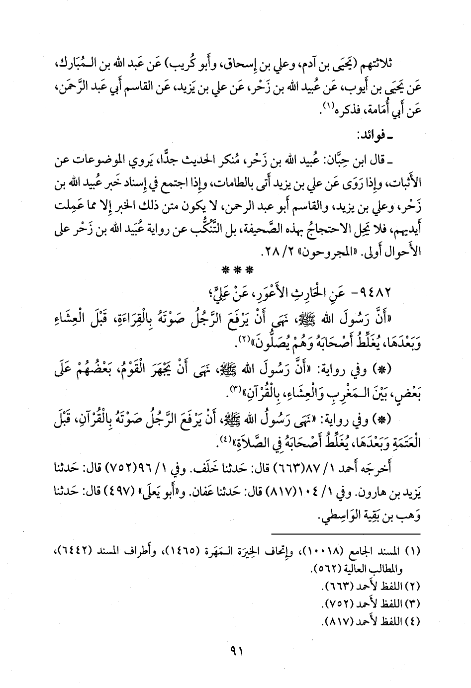 أربعتهم (خلف بن الوليد، ويزيد، وعفان بن مسلم، ووهب) عن خالد بن عبد الله الطحان، عن مطرف بن طريف، عن أبي إسحاق السبيعي، عن الحارث بن يزيد الأعور، فذكره (¬٤).