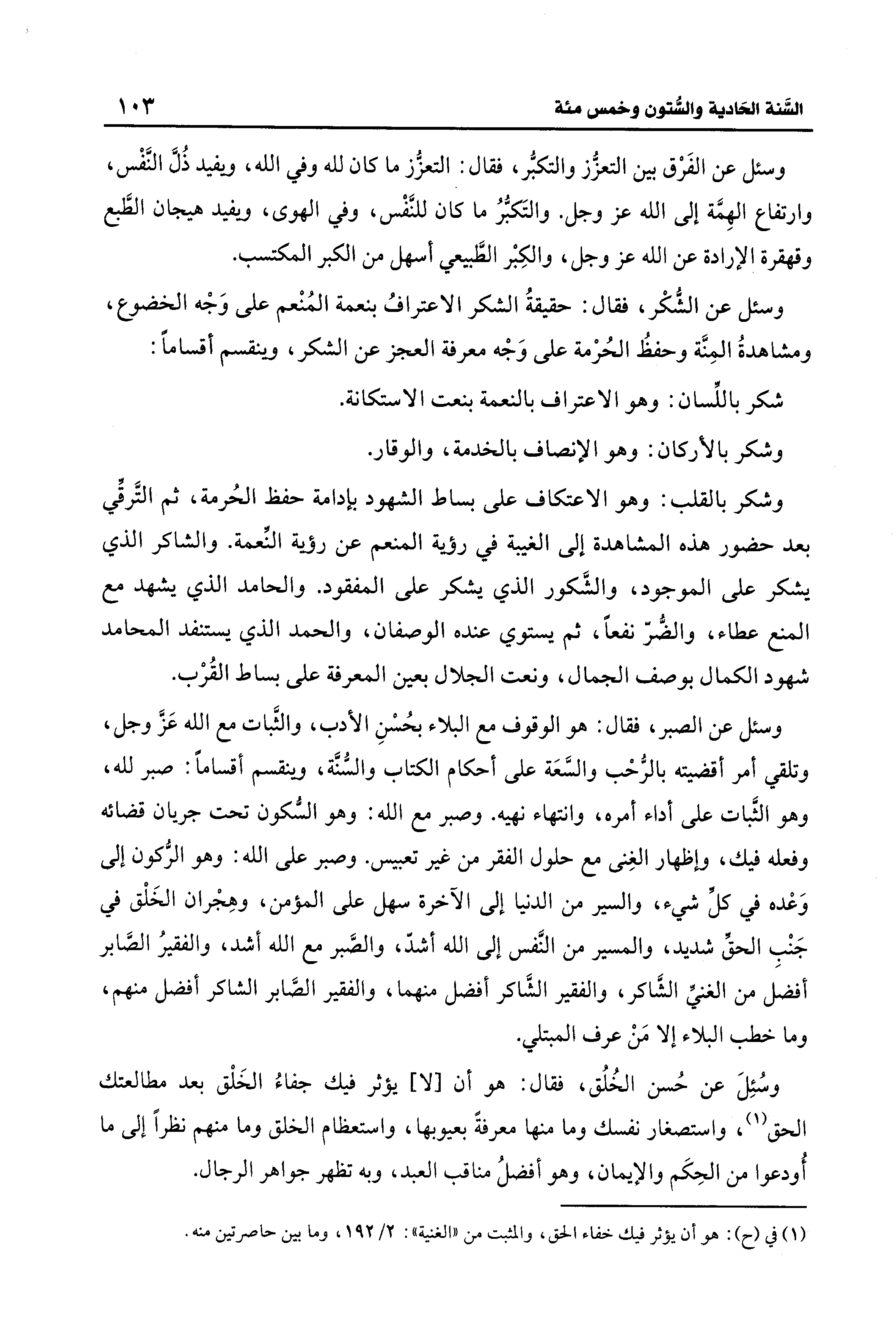 وسئل عن الشُّكْر، فقال: حقيقةُ الشكر الاعترافُ بنعمة المُنْعم على وَجْه الخضوع، ومشاهدةُ المِنَّة وحفظُ الحُرْمة على وَجْه معرفة العجز عن الشكر، وينقسم أقسامًا: