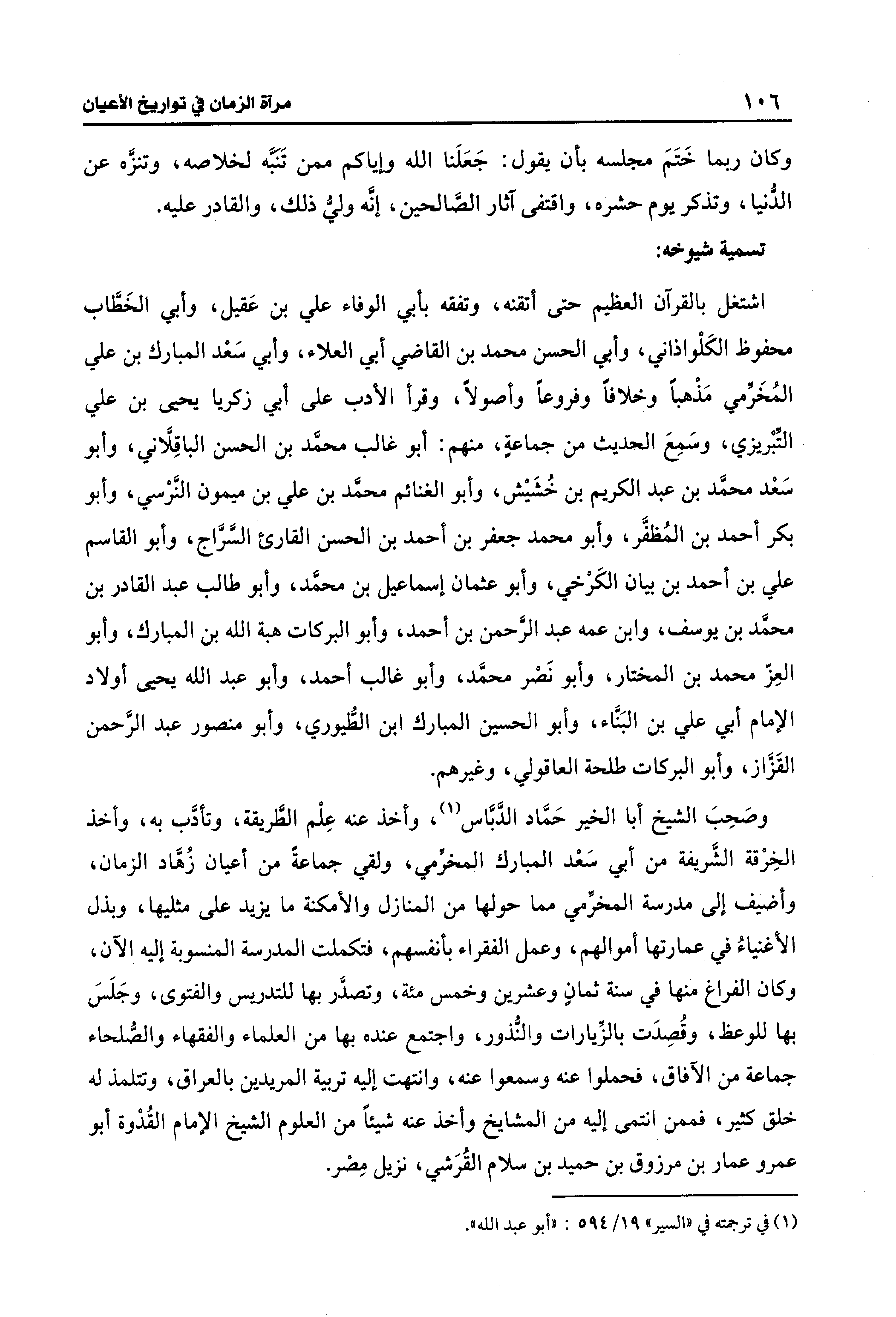 وصَحِبَ الشيخ أبا الخير حَمَّاد الدَّبَّاس (¬1)، وأخذ عنه عِلْم الطَّريقة، وتأدَّب به، وأخذ الخِرْقة الشَّريفة من أبي سَعْد المبارك المخرِّمي، ولقي جماعةً من أعيان زُهَّاد الزمان، وأضيف إلى مدرسة المخرِّمي مما حولها من المنازل والأمكنة ما يزيد على مثليها، وبذل الأغنياءُ في عمارتها أموالهم، وعمل الفقراء بأنفسهم، فتكملت المدرسة المنسوبة إليه الآن، وكان الفراغ منها في سنة ثمانٍ وعشرين وخمس مئة، وتصدَّر بها للتدريس والفتوى، وجَلَسَ بها للوعظ، وقُصِدَت بالزِّيارات والنُّذور، واجتمع عنده بها من العلماء والفقهاء والصُّلحاء جماعة من الآفاق، فحملوا عنه وسمعوا عنه، وانتهت إليه تربية المريدين بالعراق، وتتلمذ له خلق كثير، فممن انتمى إليه من المشايخ وأخذ عنه شيئًا من العلوم الشيخ الإمام القُدْوة أبو عمرو عمار بن مرزوق بن حميد بن سلام القُرَشي، نزيل مِصْر.
