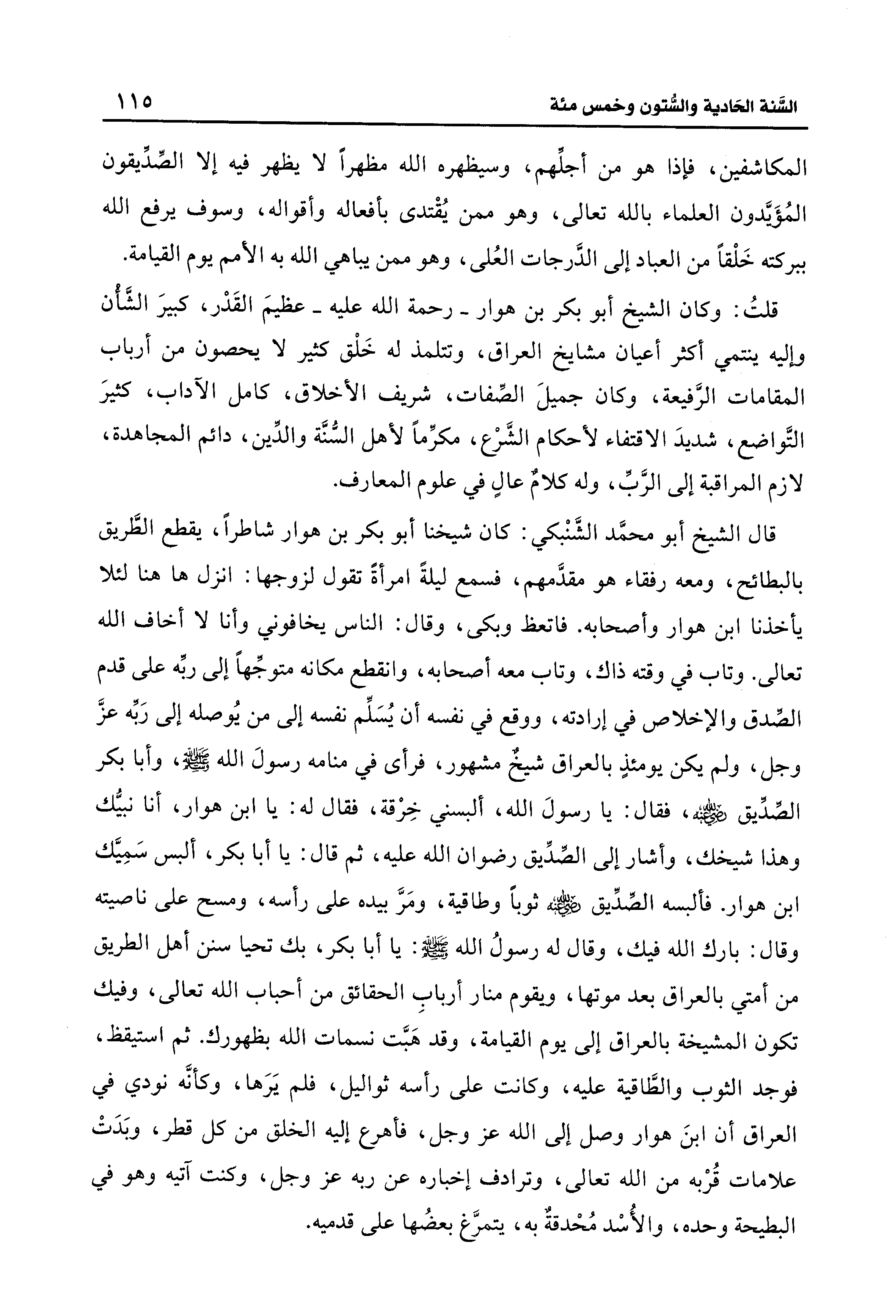 قلتُ: وكان الشيخ أبو بكر بن هوار - رحمة الله عليه - عظيمَ القَدْر، كبيرَ الشَّأْن وإليه ينتمي أكثر أعيان مشايخ العراق، وتتلمذ له خَلْق كثير لا يحصون من أرباب المقامات الرَّفيعة، وكان جميلَ الصِّفات، شريف الأخلاق، كامل الآداب، كثيرَ التَّواضع، شديدَ الاقتفاء لأحكام الشَّرْع، مكرِّمًا لأهل السُّنَّة والدِّين، دائم المجاهدة، لازم المراقبة إلى الرَّبِّ، وله كلامٌ عالٍ في علوم المعارف.
